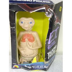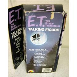 This is E. T. the Extra-Terrestrial talking figure. He is approximately 7 inches. He is made of plastic and is in his original box. He is in good condition. The box has some damage.
