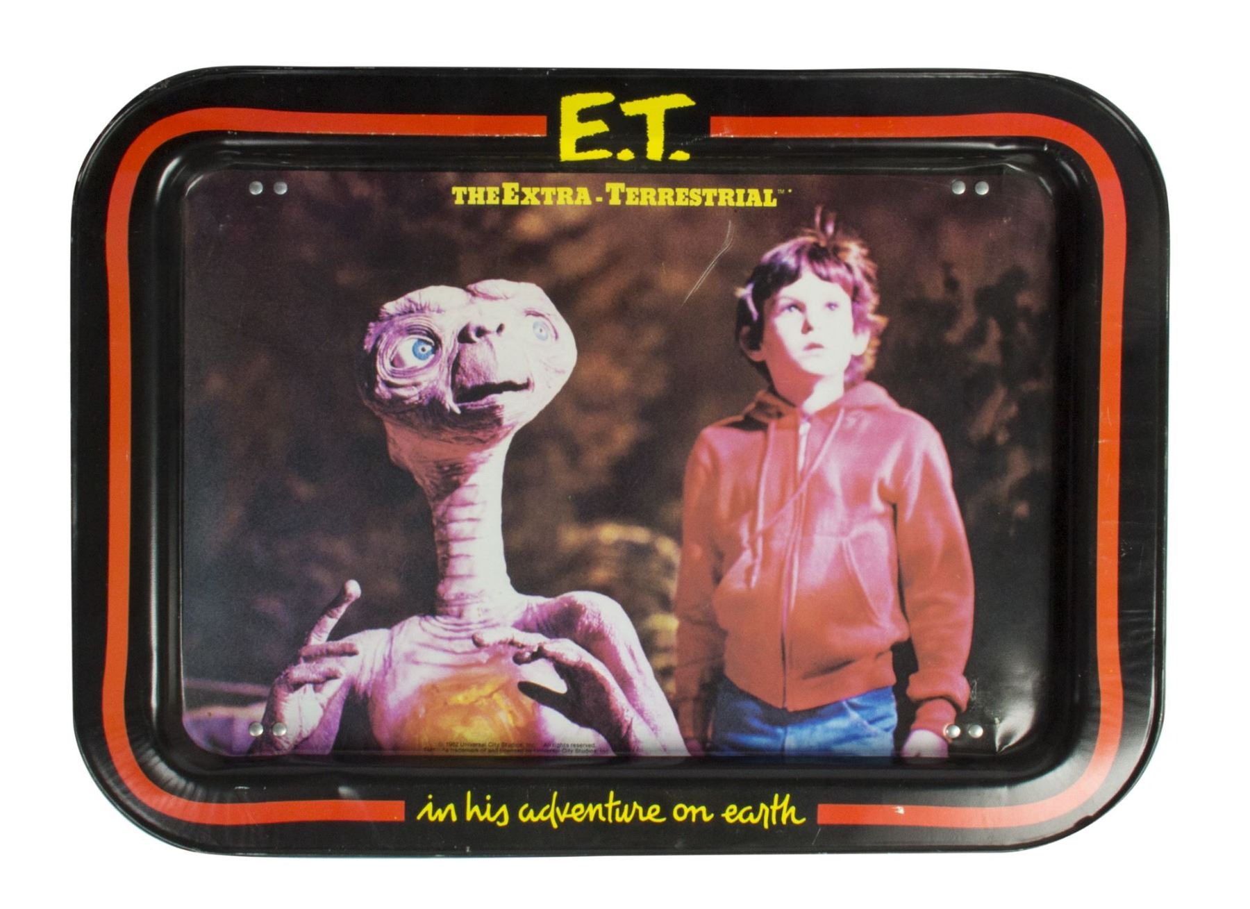 (Universal, 1982) A tin photo tray featuring Elliott and E.T. from "E.T. the Extra-Terrestrial". Created by Universal City Studios Inc., the tray has two collapsible legs on the bottom that still function very well. Measuring 12.75"x17.5", the tray is in good condition overall with some scratches and wear throughout from use and storage.