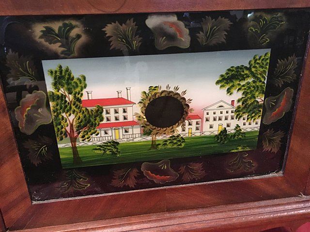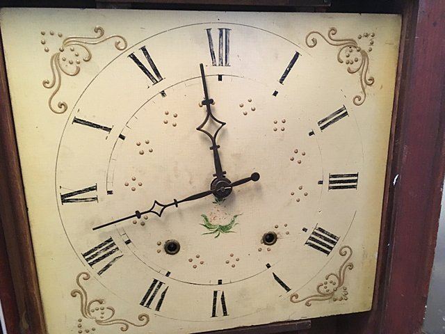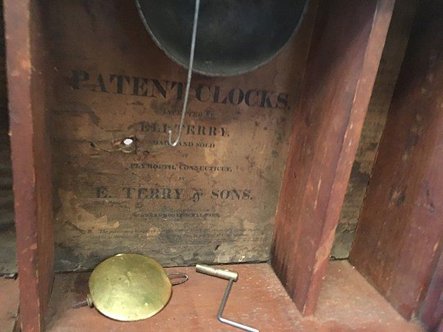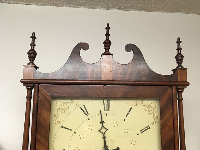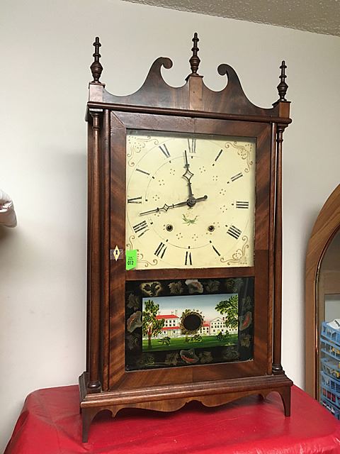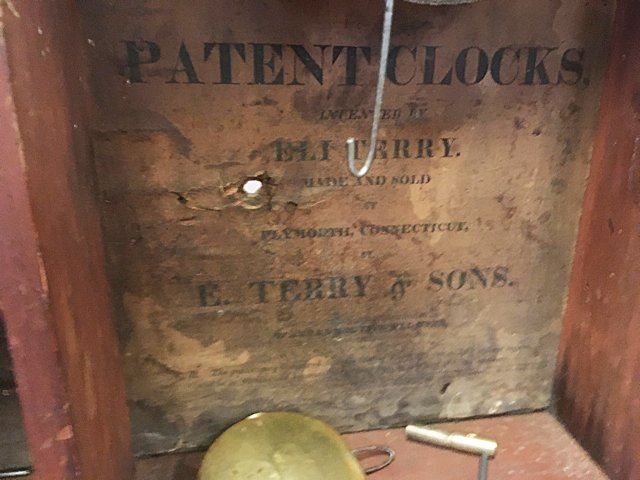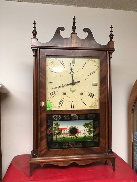E. Terry & Sons, Plymouth, Connecticut, c. 1825, scroll top case, turned columns, hand painted dial, reverse painted tablet, label "Patent Clocks, Invented by Eli Terry. Made and Sold in Plymouth, Connecticut, E. Terry & Sons. Measures approx. 28" tall x 17" wide x 5" deep. Many Eli Terry Clocks which depict a home or building on the reverse painted glass tablet, are actual homes in the Town of Plymouth and surrounding Connecticut towns of the time period.