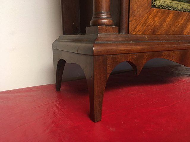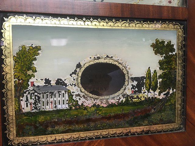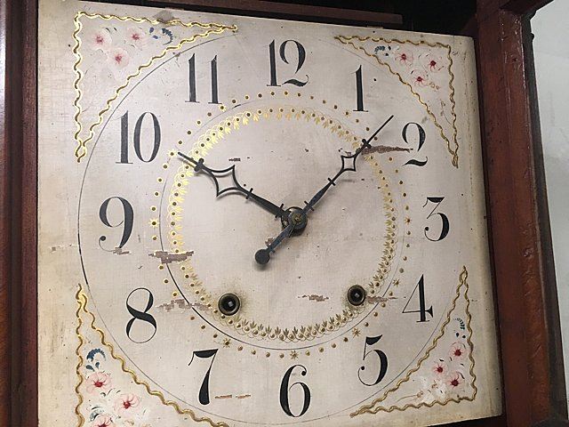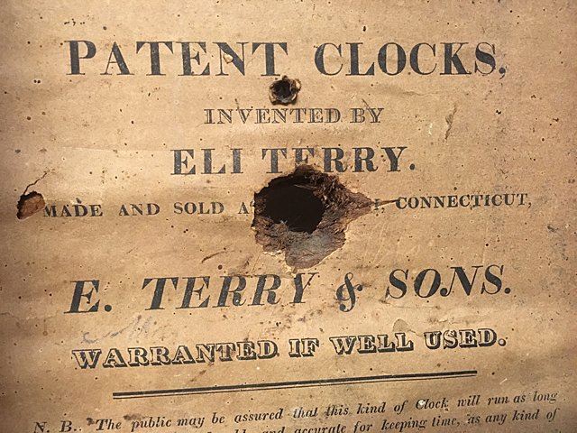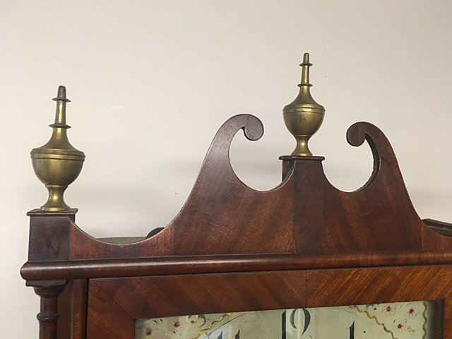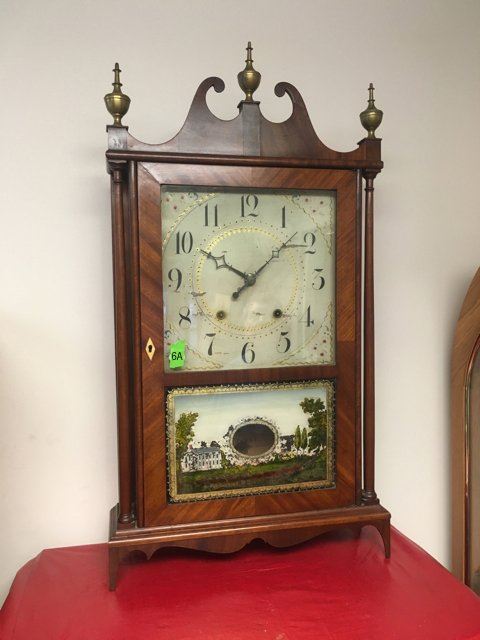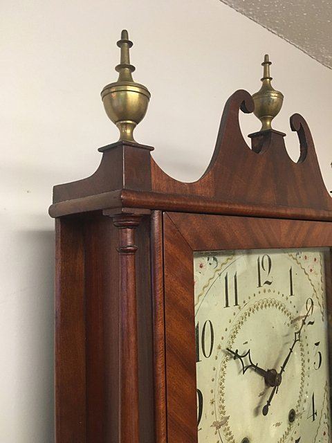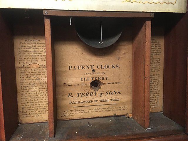 E. Terry & Sons, Plymouth, Connecticut, c. 1825, scroll top case, 3 brass urn finials, turned columns, hand painted dial with gold gilt and flowers, reverse painted tablet, country scene, nice label "Patent Clocks, Invented by Eli Terry. Made and Sold in Plymouth, Connecticut, E. Terry & Sons." Measures approx. 31" tall x 17" wide x 4" deep. Many Eli Terry Clocks which depict a home or building on the reverse painted glass tablet, are actual homes in the Town of Plymouth and surrounding Connecticut towns of the time period.