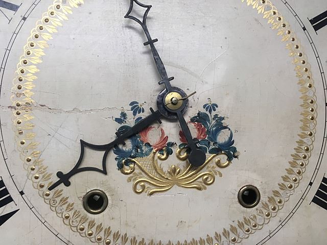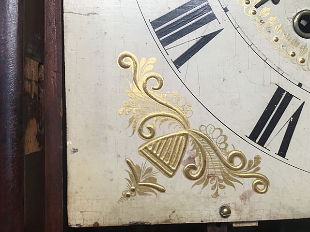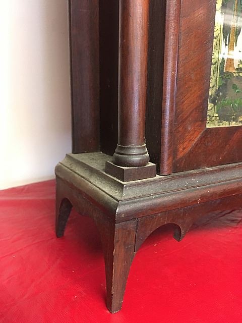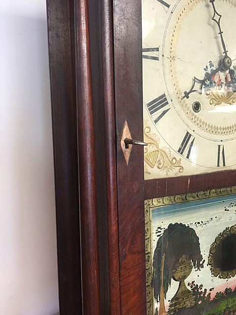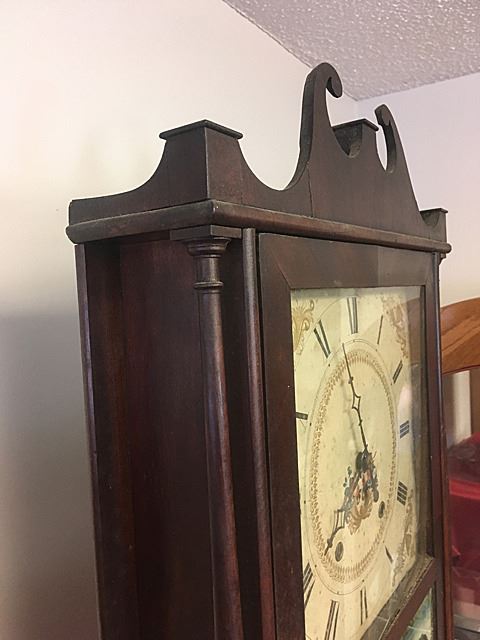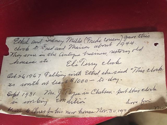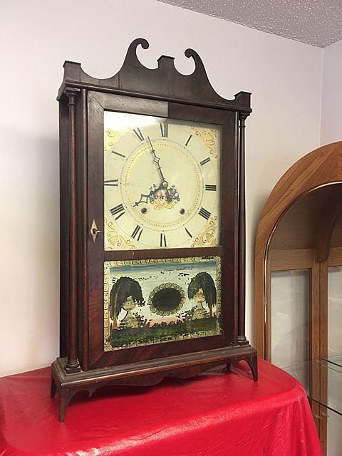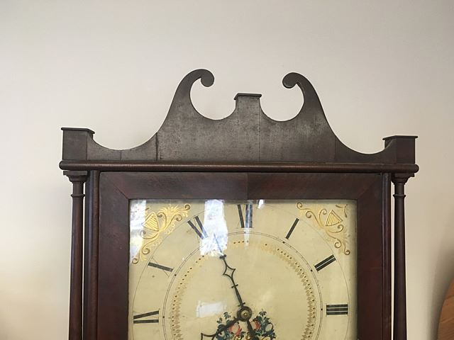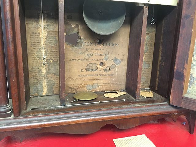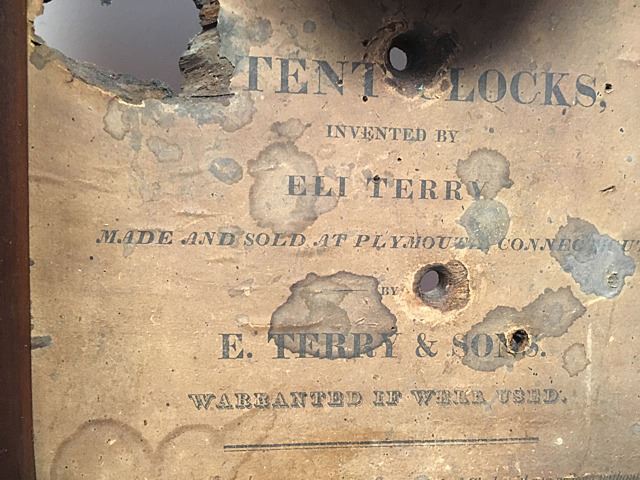 Eli Terry & Sons Mahogany Pillar and Sroll Shelf Clock, Plymouth, Connecticut, c. 1825. Scroll top case, hand painted dial with raised gilt and center flowers, reverse painted glass tablet, label "Patent Clock, Invented by Eli Terry, Made and Sol at Plymouth, Connecticut by E. Terry & Sons". (Some loss to back of clock). Has hand written note with clock showing ownership history from 1944. Wooden works, weight driven, 30 hour, pendulum shelf clock. Measures approx. 29" tall x 17" wide x 4 1/2" deep.