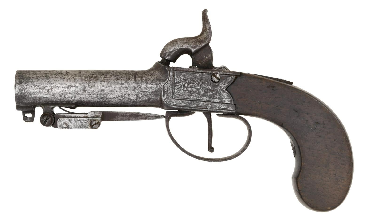BAYONET. Cal. 45. NSN. Bbl 3". Single shot percussion pistol with an under-folding bayonet produced by E&W Bond of London, England. Sides of frame exhibit light scroll engraving, with "E&W BOND/ LONDON" engraved over the top, and English proofs stamped on the underside. Under-folding trigger is retained via the trigger guard. 1 piece smooth wood grip. CONDITION: metal components exhibit a mottled gray patina, with areas of mild surface oxidation overall. Wood grip shows scattered marks from handling and storage, with a mild crack to the rear of the upper tang. (01-24141/MLW). ANTIQUE. $700-1,000.