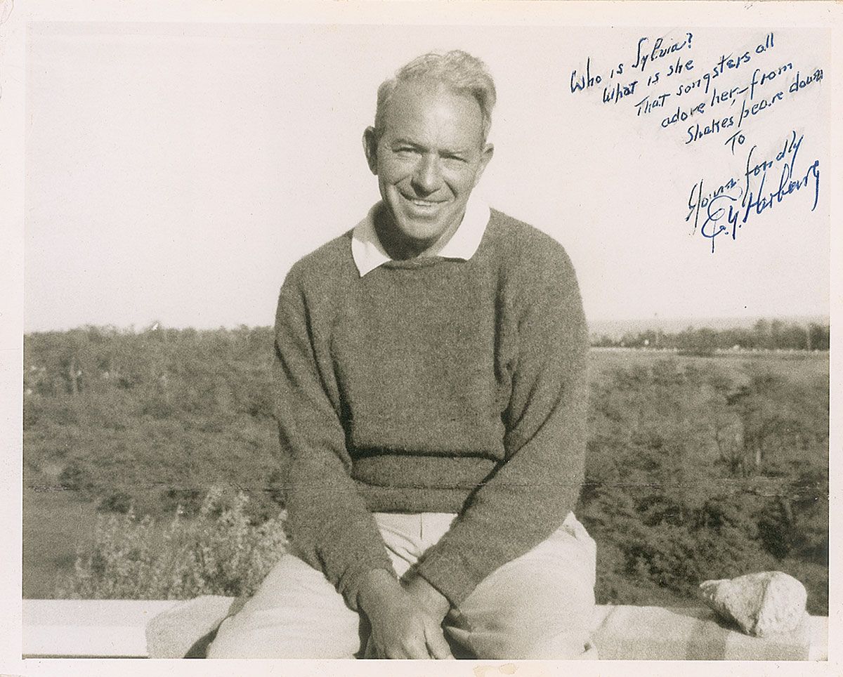 Lyricist (1896–1981) who wrote the lyrics to the standards, ‘Brother, Can You Spare a Dime?,’ ‘April in Paris,’ and ‘It's Only a Paper Moon’ as well as all of the songs in The Wizard of Oz. Matte-finish 8 x 10 photo of Harburg sitting outdoors, signed and inscribed in blue ballpoint “Who is Sylvia? What is she that songsters all adore her—from Shakespeare down to Yours fondly, E. Y. Harburg.” In fine condition, with a few dings and light surface peeling to left edge, and Harburg tracing over his inscription.