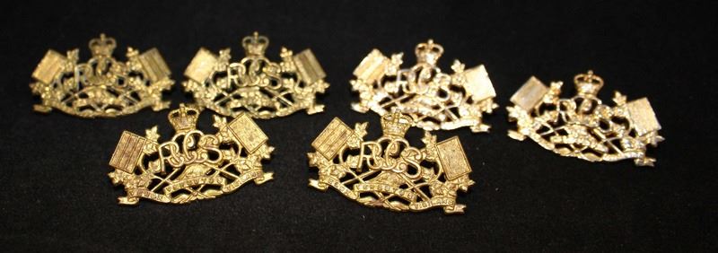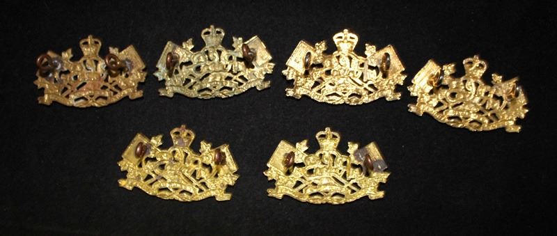 All Queens Crown, RCC of S design. All voided crown, lug fasteners. 4 - brass metal, slight different shades. Two with 3 part flag to left and two with solid flag to left (These two SCULLY maker marked). 2 - Gold plated, opposite flags, SCULLY made. Lot of 6.