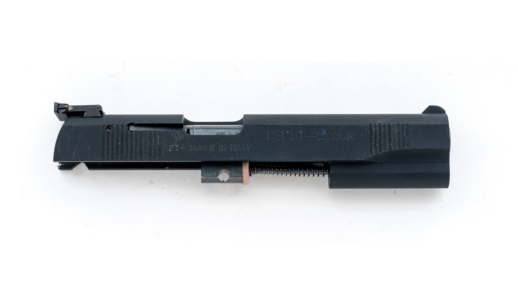 EAA 1911 .22 LR Conversion Kit, 5'' barrel, matte blue slide, integral blade front sight, rear sight is adjustable for both windage and elevation, with two (2) 10-round plastic magazines, two (2) additional recoil springs, sight adjustment tool, and blue plastic case. Made in Italy. In excellent lightly used condition, with scattered light scuffs to the matte surfaces. Bright bore also rates excellent. Est.: $125-$250.