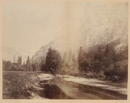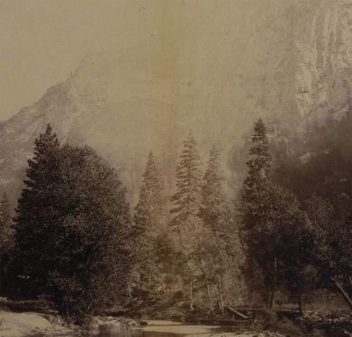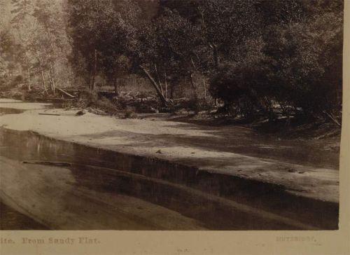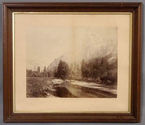 EADWEARD MUYBRIDGE ALBUMEN PRINT OF YOSEMITE, 17"x21 1/2" image, identified on studio mount "Bradley & Rulofson" and titled "Valley of Yosemite from Sandy Flat", circa 1865, condition: acid burn down center of image, untouched attic found, see NOTICES BOX