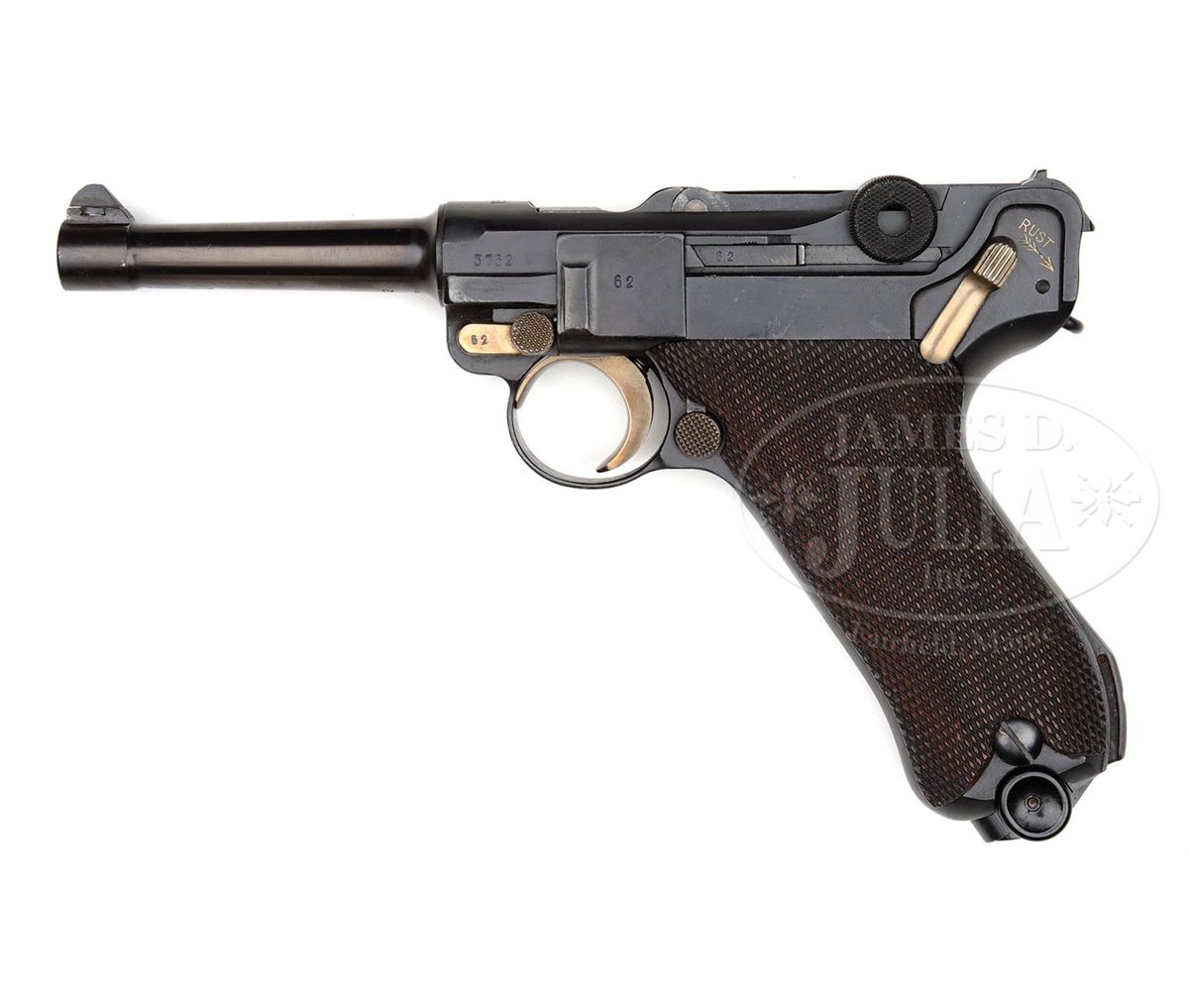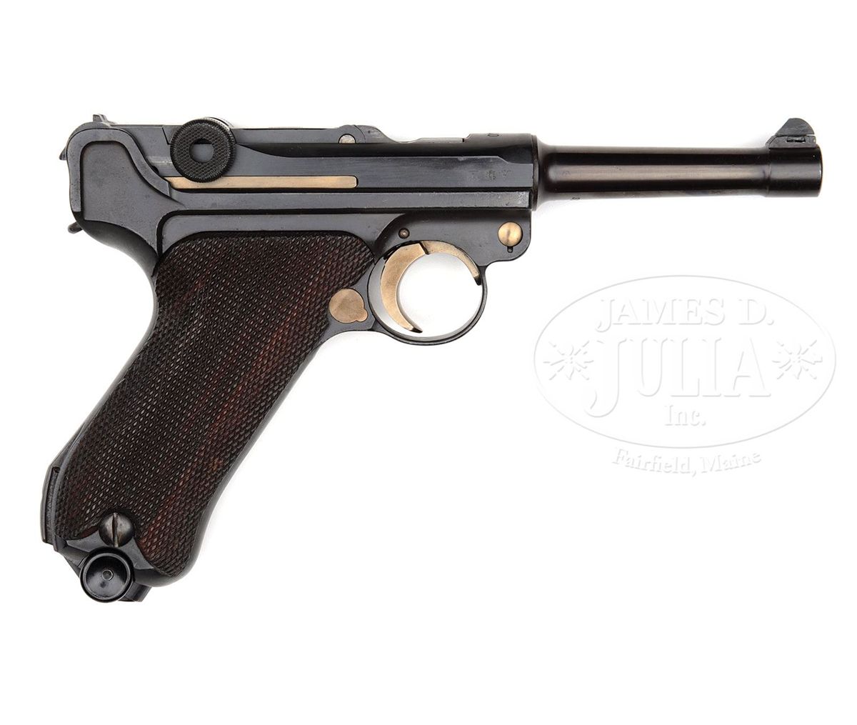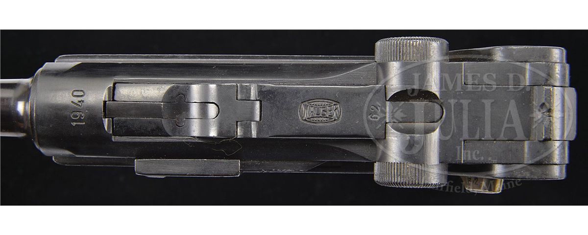 SN 2154. 4" 9 mm bbl. "1940" above chamber, Mauser banner on center toggle link. "RUST" marked safety. "Geladen" marked extractor on both sides. Eagle/655 proofs on right receiver. All numbered parts on gun are matching. Bbl appears to have been numbered later. Black plastic bottom "FXO" marked magazine. This gun appears on page 560 of Dr. Geoffrey Sturgess' The Borchardt & Luger Automatic Pistols. It was made for Dutch contract but was diverted to the Wehrmacht when Germany invaded Holland in 1940 and subsequently inspected and proofed for the German Army. PROVENANCE: Collection of Dr. Geoffrey Sturgess, ex-Visser collection. CONDITION: Arsenal refinish to 97% blue and 97% straw. Bore is frosted. Checkered walnut grips are lightly worn. Magazine is excellent. Mechanics are sound. 4-52887 BWS23