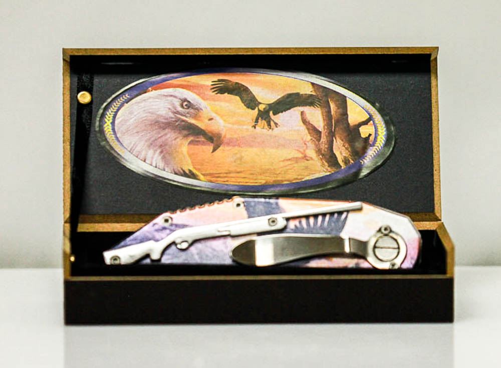 EAGLE AND SHOTGUN DESIGN STAINLESS STEEL TONTO BLADE KN **|**|** EAGLE AND SHOTGUN DESIGN STAINLESS STEEL TONTO BLADE KNIFE W/ WOODEN BOX