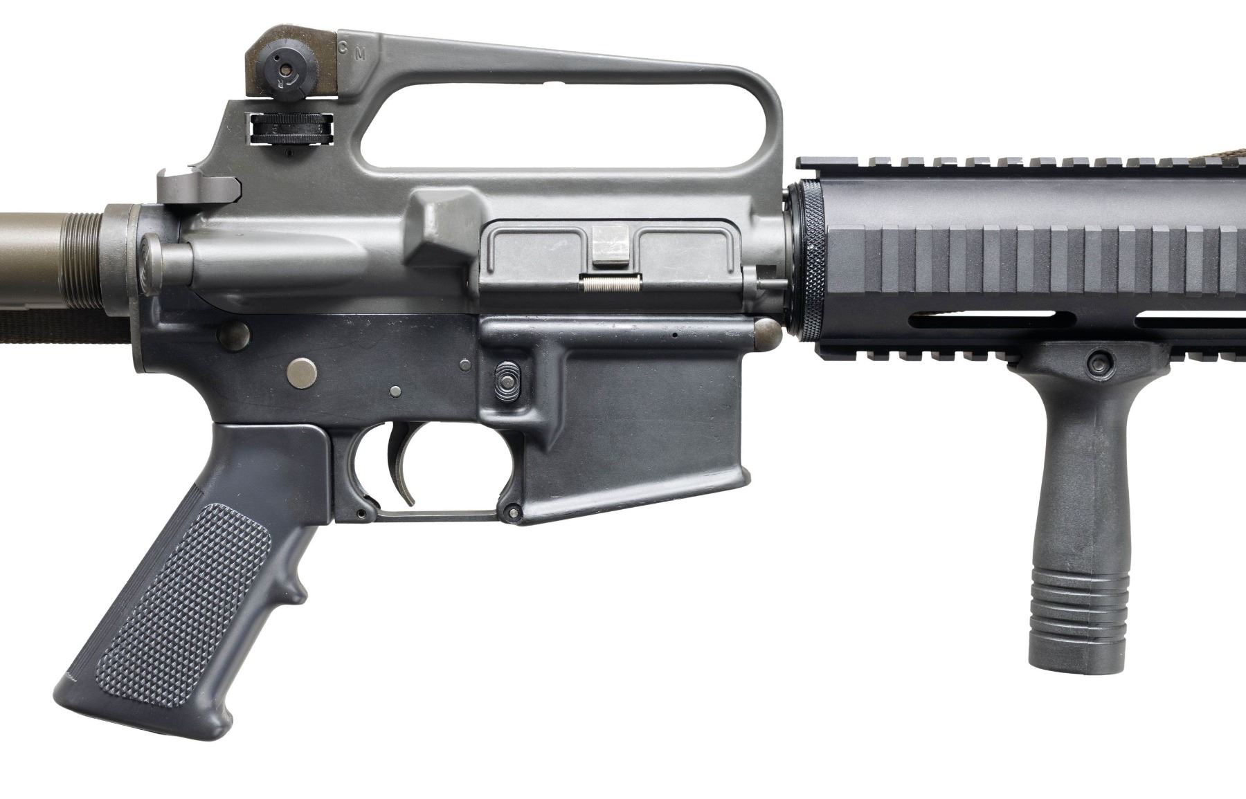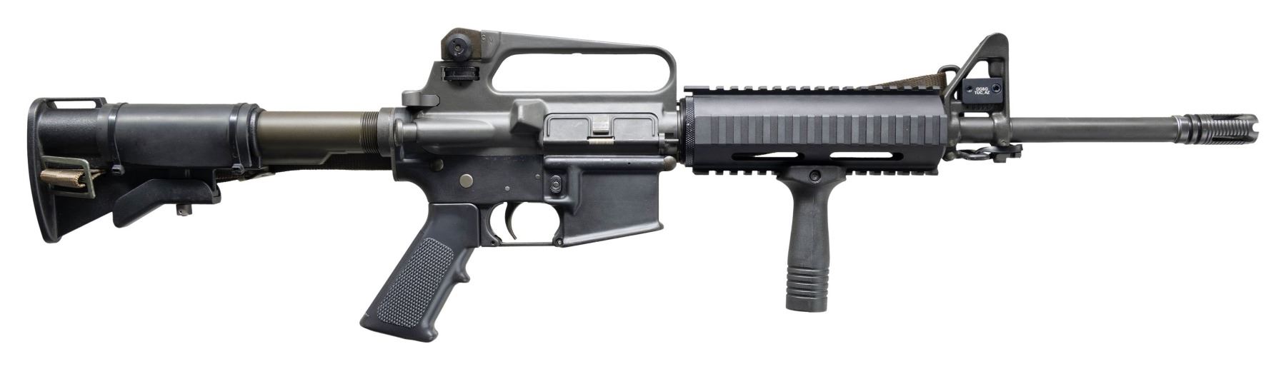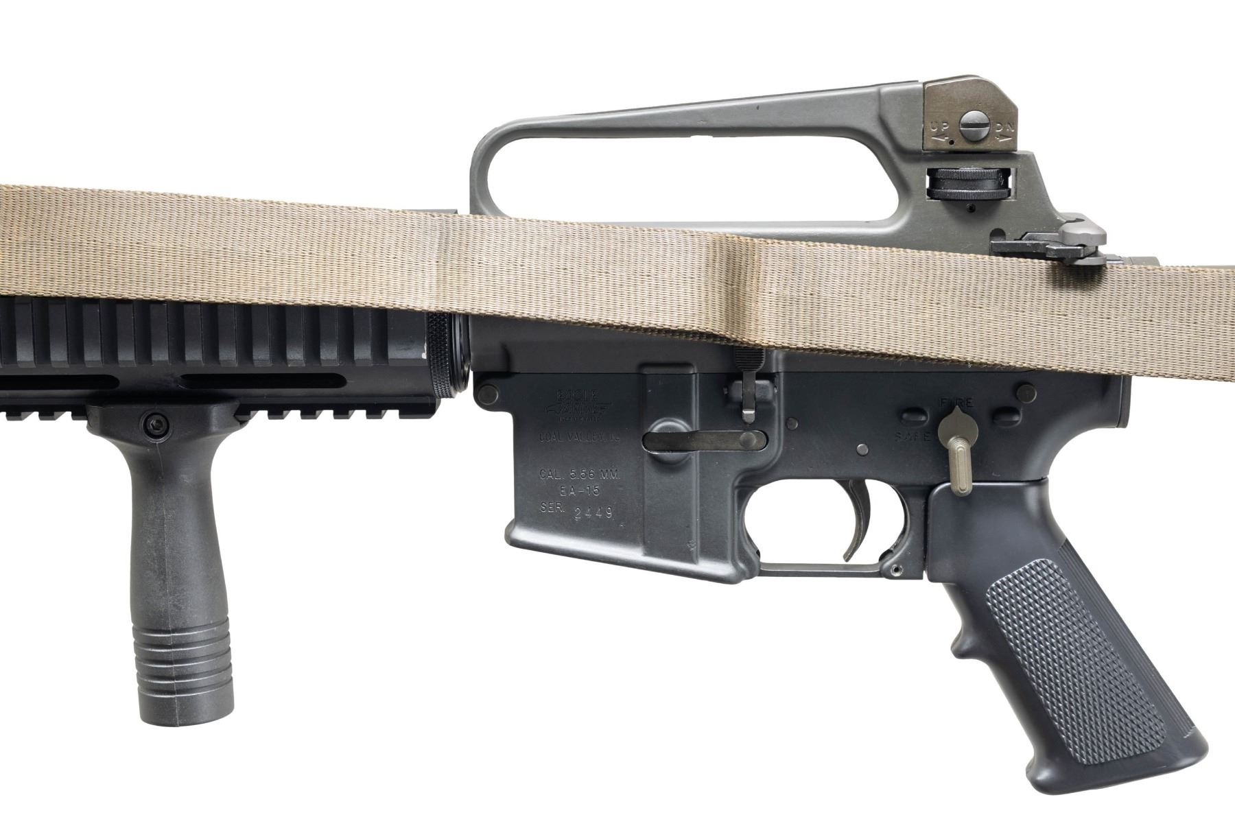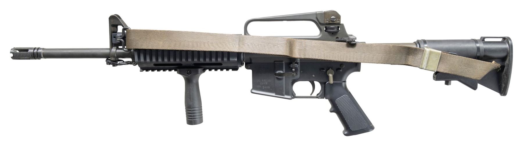 Cal.5.56mm. S# 2449. Bbl. 16". Pinned flash hider. Protected post front sight / gas block / bayonet lug. Quad rail free floating front handguard. Carry handle upper receiver w/ round forward assist & brass deflector. Windage & elevation adjustable dual aperture rear peep sight. Eagle Arms lower receiver. Left side controls. 3 position, collapsible aluminum shoulder stock. SP1 profile bolt carrier. Plastic vertical foregrip. Left side OD Green canvas sling. CONDITION: light gray finish on upper receiver & dark black finish on lower receiver complete & consistent. No visible sign of excessive use. Bright bore w/ strong rifling. Fire control mechanism appears to function correctly when cycled by hand. (25-2825/JZ). MODERN. $400-600.