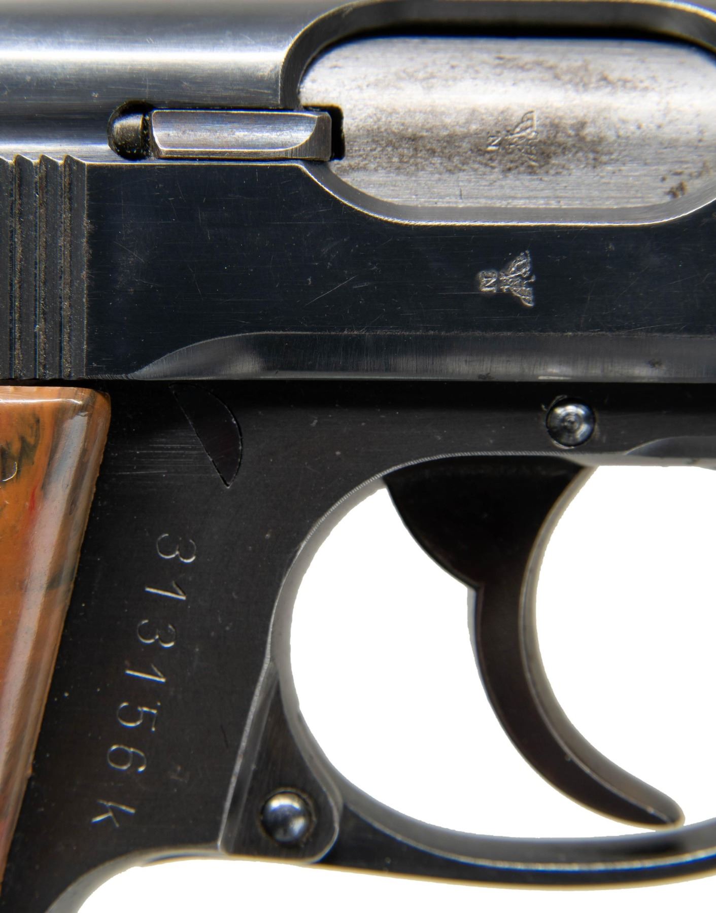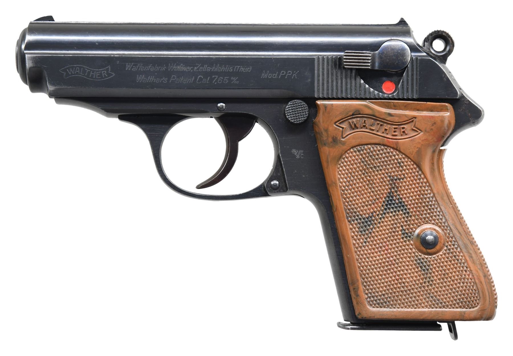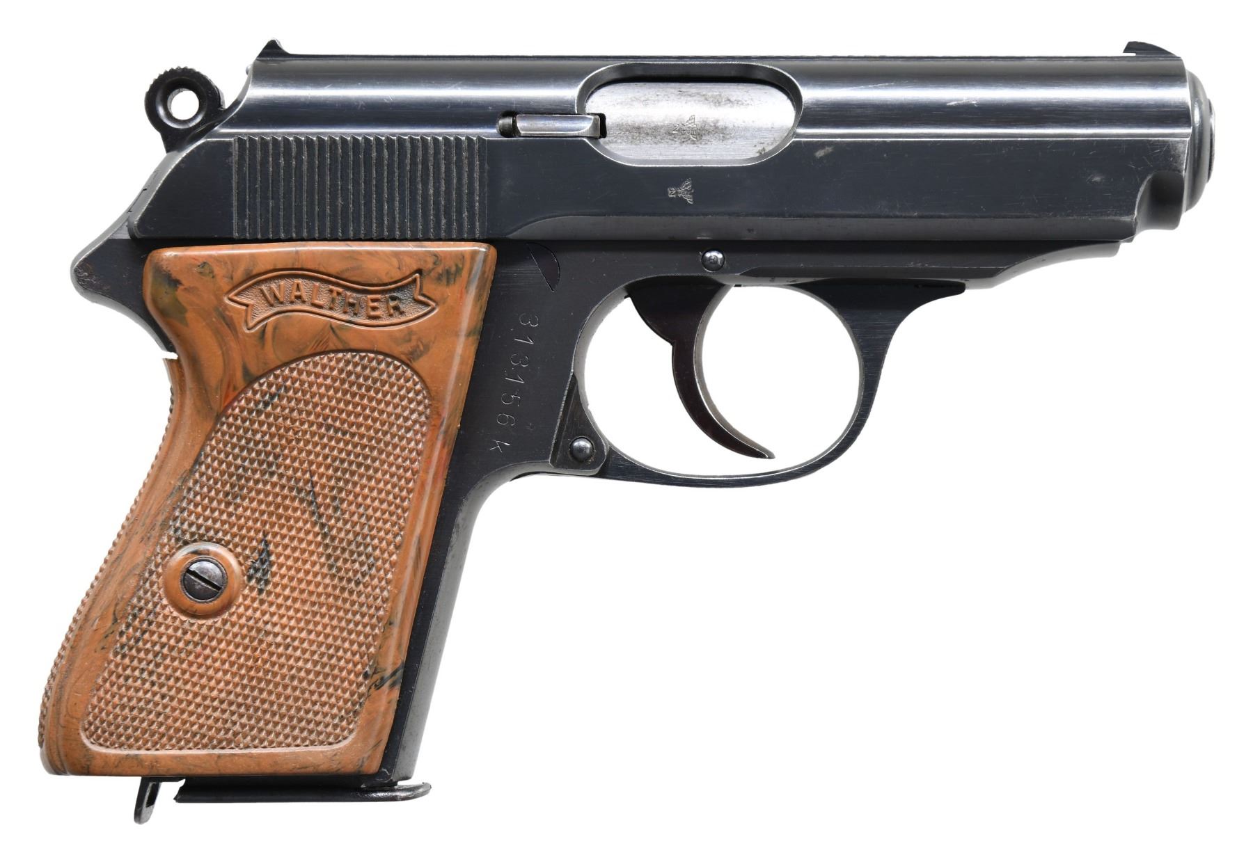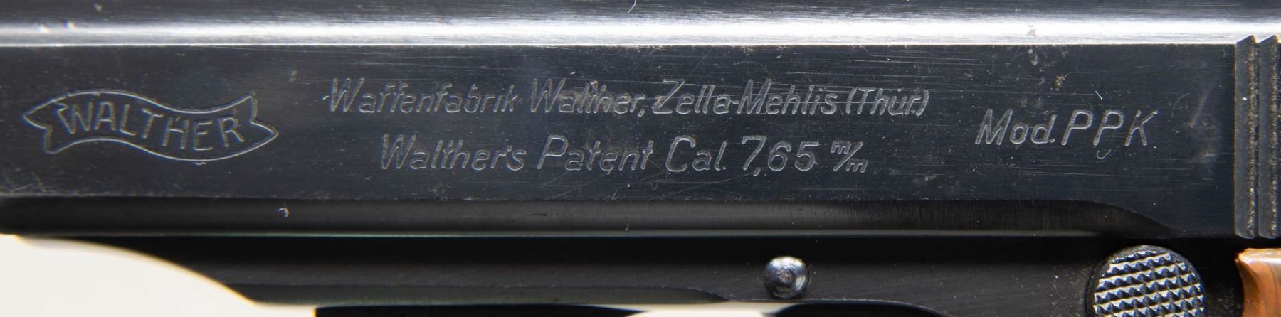 SEMI-AUTOMATIC PISTOL. Cal. 7.65mm. S# 313156k. Bbl. 3 1/4". Model PPK semi-automatic pistol mfg. by Walther in 1941 for police use. The left side of the slide is marked with the Walther banner logo, followed by markings stipulating Walther's mfg. information, as well as the model and cal. designations. Left side of the frame is marked with an Eagle/C police proof. Right side of the frame, slide, and bbl. exhibit a German Eagle/N commercial nitro proof. Metal components exhibit a blue finish overall, save for on the chamber area, which is polished in-the-white. Frame is mounted with a 1-piece Walther banner checkered mottled brown synthetic grip. Slide features a solid grooved matte rib, with a fixed blade front sight and fixed U-notch rear sight. Slide matches the frame via "156", which is etched on the interior, parallel to the ejection port. MAGS: 1 blued 7-rd. CONDITION: metal components retain the vast majority of their original factory blue finish, exhibiting some light to mild edge wear, some scattered superficial handling marks, as well as some scattered areas of light surface oxidation overall. Sides and rear of frame spur exhibit spots of mild pitting. Mirror bore, exhibiting some spots of light pitting, while retaining well defined rifling throughout. Grips show mild age related warping and scattered superficial marks from handling and storage, but otherwise remain sturdy and serviceable. PROVENANCE: The Estate Collection of Charles Wagner. (25-362/MLW). CURIO. $1,200-1,800.