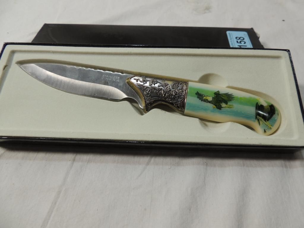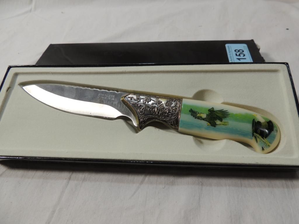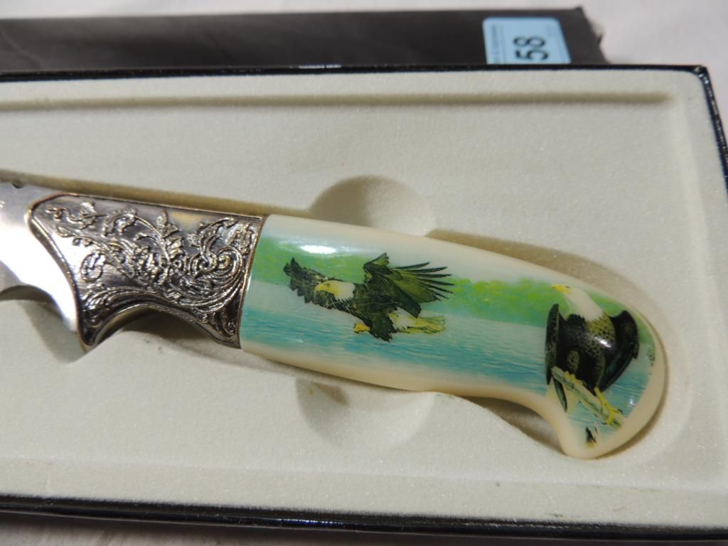 EAGLE KNIFE BLADE. FLOWER DETAIL ON HANDLE. STAINLESS STEEL BLADE. FLYING EAGLE AND SEATED EAGLE. AS SHOWN. SEE PHOTO FOR MORE DETAILS.