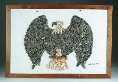 EAGLE PICTURE DONE WITH BROKEN AND DAMAGED STONE TOOLS AND TWO BOARDS OF ARTIFACTS. Eagle signed ""M.D. Edds"". One board with rough and damaged flint tools displayed in a circle of various times and materials. Second board with various stone Indian artifacts with gorget in center. CONDITION: Poor to fair. 9-25984-102 The Tennessee Collection of Prehistoric Indian Artifacts from the Allen Graves Estate. SPECIAL NOTE: We do not regularly sell Prehistoric Indian stone artifacts and therefore have very little experience and no expertise in this area. All of the following lots have come from the Collection of the Late Allen Graves of Tennessee. The collection was inherited some years back by his daughter, who now lives in Maine. This collection was consigned to us directly from her. We employed someone to generally identify styles and types, but as stated above, due to our lack of expertise in this field, we can not guarantee the age or origin of the following pieces. We are relying on you, the buyer, to determine to your satisfaction the origin and age of each item in the collection.