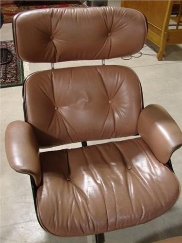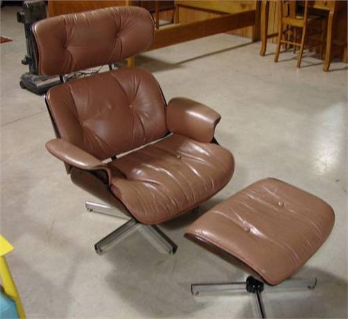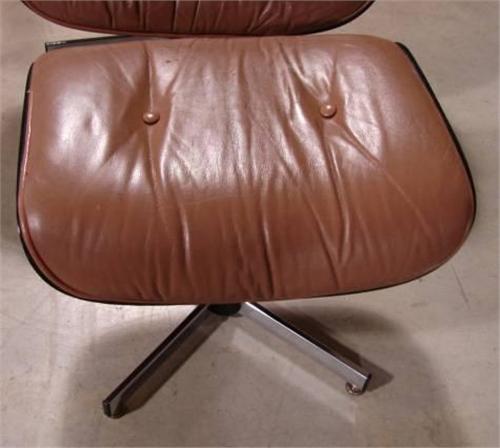EAMES STYLE OFFICE CHAIR & OTTOMAN. Chrome base & leather back & seat. Seat shows signs of wear. 40” H to top of back, 33” W, 14.5” H to top of seat. Ottoman: 15.5” H, 19.75” x 17.5”