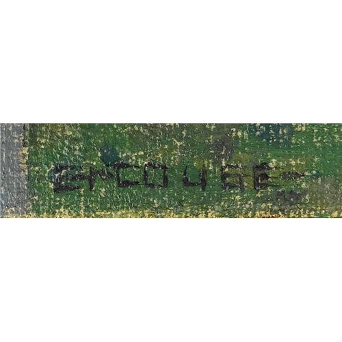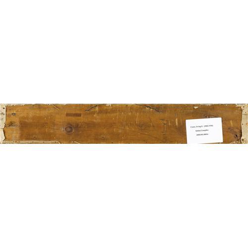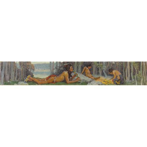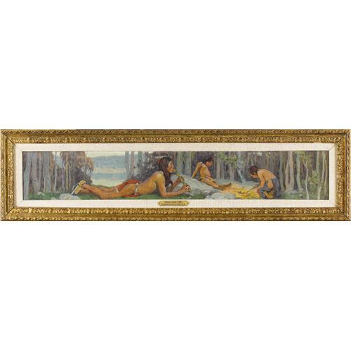 <B>EANGER IRVING COUSE</B></I> (American 1866-1936)<BR><I>Study for Flute Player with his Sons (Indian Campfire),</B></I> 1916<BR>Oil on canvas<BR>6 x 35 inches (15.2 x 58.4 cm)<BR>Signed lower left:<I> Couse</B></I><BR><BR>Provenance:<BR>Dorothy and William Harmsen, Sr. (Denver, Colorado)<BR><BR>Literature:<BR>Couse family Archives;<BR>Ellen Landis, <I>Eanger Irving Couse: Image Maker for America</B></I> (Albuquerque, New Mexico: Albuquerque Museum Foundation, 1991) p. 19;<BR>Nicholas Woloshuk, <I>E. Irving Couse 1866-1926</B></I> (Santa Fe, New Mexico: Santa Fe Village Art Museum, 1976), illus. p. 37<BR><BR>Couse was born and raised in the logging town of Saganaw, Michigan, where as a youngster he drew the Chippewa Indians who lived nearby. While still a teenager he attended the Art Institute of Chicago and the National Academy of Design in New York. At the age of twenty he traveled to France, where he studied at the Académie Julien under William Adolphe Bouguereau and Tony Robert-Fleury. Couse remained in France for nearly a decade, and specialized in painting landscapes and peasant subjects. In 1889, he married fellow art student Virginia Walker, a rancher's daughter from the state of Washington. In 1891 they settled for a year at the Walker family's ranch in Klikitat County. While living there Couse produced his first oil paintings of Native Americans.<BR><BR>In 1898, Couse established a winter studio in New York, and spent the next few summers away from the city, painting in Washington, Connecticut and France. In May 1902, Couse learned of Taos, New Mexico through a conversation with his artist friend Ernest Blumenschein. Shortly thereafter he traveled to Taos for the first of his regular summer stays. In 1910 he purchased an old Spanish monastery, which he converted into a studio and home. Five years later, when the Taos Society of Artists was formed, Couse was elected its first President. In 1928, he and his family gave up their New York home and settled permanently in Taos.<BR><BR>Couse painted Study for Flute Player with his Sons in the summer of 1916. A year later it served as the model for the 20 x 123 inch oil painting created as an over-mantel decoration for the private collection of George Zabriskie.<BR><BR>According to the artist's granddaughter Virginia Couse Leavitt, ”It is possible that Couse may have done only one or two other over mantels . . . . Couse called these 'decorative panels' and the only other that I have catalogued in that way is a painting measuring 20 x 42', also painted in 1916, the original owner of which was a Mr. Bradwell in Pittsfield MA. The subject is somewhat similar . . . but shows two adult males, one on the left lying on his stomach playing a flute, another on the right tending a campfire, preparing to roast a duck that lies on the ground beside the fire. Although this painting is also set under the trees beyond which there is a distant view, the composition of the two is quite different' (E-mail correspondence with Heritage Auction Galleries, April 4, 2007).<BR><BR> Couse may have used a photograph as the basis for this oil study since he rarely sketched outdoors. More commonly he worked from photographs he took of models during field trips. Ellen Landis has noted that these outdoor sessions were 'often based around a particular theme, such as hunting, flute playing, or instructing a child, and resulted in images for future reference' (Eanger Irving Couse: Image Maker for America Albuquerque, New Mexico: Albuquerque Museum Foundation, 1991 , p. 19). Couse created many pictures featuring a Pueblo Indian man playing a flute, often accompanied by a woman whom he is serenading.<BR><BR> Typically, Couse depicted his subjects going about their tasks in private communion with the natural world. They often appear in a tranquil woodland setting. Alta Edmondson has noted that in Taos the artist found a 'perfect backdrop for his figures --rivers, lush valleys, pines, quaking aspen, soft-lined, soft-colored adobe houses, sunsets and sunrises of unequalled splendor' ('E. Irving Couse, Painter of Indians,'<I>Panhandle-Plains Historical Review</B></I> 42 1969 : 12). In keeping with his idyllic vision, as well as reflecting the lingering influence of his academic training, Couse portrayed men wearing little more than a breech cloth. As here, he regularly depicted his figures in profile, usually crouching or squatting on their heels. A camp fire appears in many of his works, and the glowing light reflecting off the skin of his models was something the artist relished painting. <B>Condition Report:</B> canvas stretched over wood block, 2 inch horizontal tear at lower margin beneath foreground figure's knee, no restoration original unlined canvas, strong color<BR><BR><b>Shipping:</b> Requires 3rd Party Shipping (<a target="_blank" href="http://www.heritageauctions.com/common/shipping.php">view shipping information</a>)