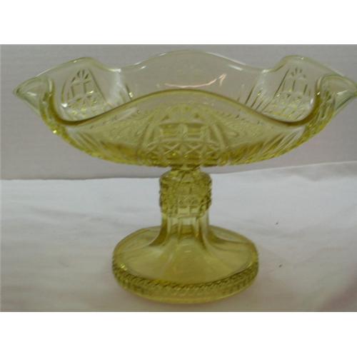 The Cathedral pattern was made by Bryce Brothers Glass Co. of Pittsburgh, PA circa 1885. The pattern was continued by The United States Glass Co. after their merger of 1891. The original name of this pattern was Orion and it is also known as Waffle and Fine Cut. This beautiful amber open compote is 6-1/4" tall and 9-1/2" in diameter. The foot is 4-1/4" in diameter. There are some bubbles and straw marks but there are no chips, flakes or cracks.