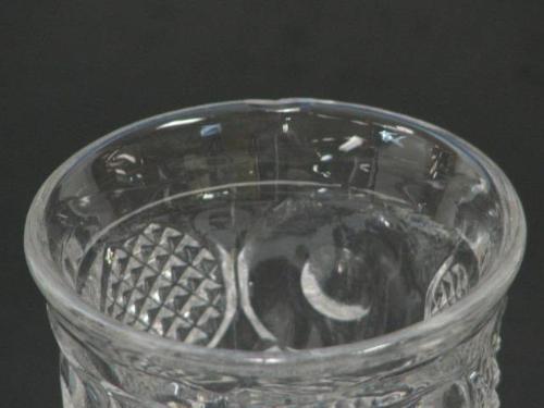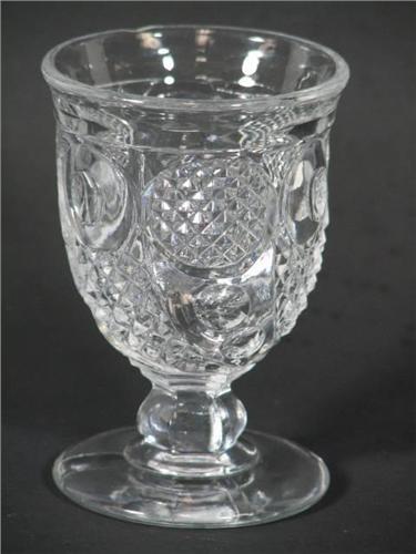 A Flint glass Footed Glass in the Horn of Plenty (aka Comet - McKee) pattern produced by the Boston and Sandwich Glass Co. beginning in the 1840's. Top rim has one small flake. This Horn of Plenty Footed Glass measures 3.75" tall by 2.5" diameter.