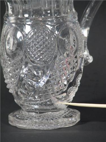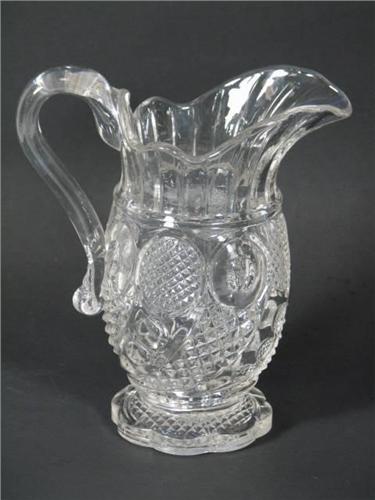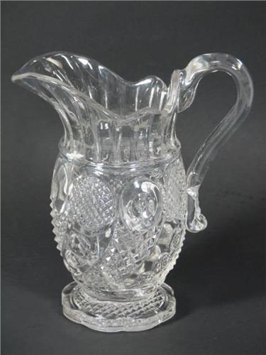A Flint glass Creamer in the Horn of Plenty (aka Comet- McKee) pattern produced by the Boston and Sandwich Glass Co. beginning in the 1840's. This piece has an internal fracture along the base. This Horn of Plenty Creamer measures 7" tall by 3" diameter, 6" across from spout to handle.