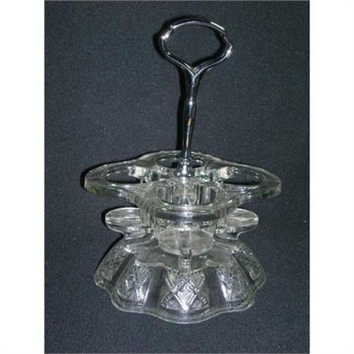 This is a great little item in the Grated Diamond and Sunburst pattern. It was made by The George Duncan & Sons Glass Co. of Pittsburgh, PA circa 1895. The pattern was originally called Duncan's No. 20. This is a condiment holder with four positions for oil, vinegar, salt & pepper or a mustard. The main part is made of glass with the pattern around the skirt bottom with a metal handle. I'm not sure if the handle is original but it does fit. The holder is 9-1/2" tall to the top of the handle, 4" to the top of the glass holder and 5-1/2" in diameter at the top. The skirted bottom is 6" in diameter. This is a one piece pressing of glass. There may be some bubbles and straw marks but there are no chips, flakes or cracks.