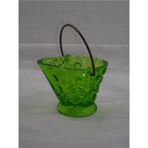 This is a great green glass toothpick holder in the Daisy & Button pattern. It is shown in an 1892 catalog from The United States Glass Corp. as being made at Factory A (Adams & Co.). Shown in 1000 Toothpick Holders by The National Toothpick Holders Collectors Society on page 106. The original name was "Skuttle". The pattern was also made Bryce Brothers Glass Co. and Doyle & Company, all of Pittsburgh, PA circa 1880's. And also made by Hobbs, Brockunier & Company of Wheeling, West Virginia circa 1885. This coal skuttle shaped tooth pick holder has the original metal bail handle. The glass is emerald or apple green. It is 2-1/4" tall at the spout, 2" wide and 3-1/4" long, all at the rim. The body is in the Daisy & Button pattern while the pettycoat skirt bottom foot is in a fine cut pattern. This bottom ring is circular and 1-3/4" in diameter. There may be some bubbles and straw marks but there are no chips, flakes or cracks.