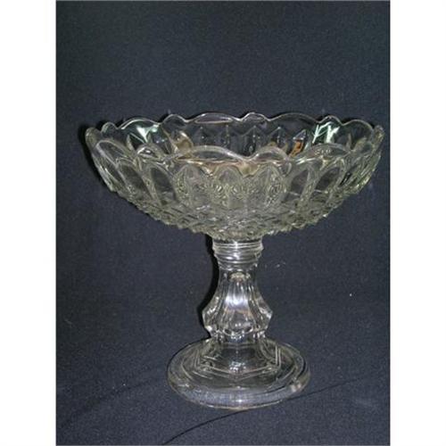 This is a beautiful open compote made by the McKee Brothers Glass Company of Pittsburgh, PA circa 1870. This pattern name is Scalloped Diamond and is shown in the 1868 and 1871 catalogs of McKee Brothers. The price list also shows 10" bowls on high foot being sold wholesale at $18.00 per dozen. This bowl on high standard is 9-1/2" tall, 10-1/4" in diameter at the rim and the foot is 5-1/4" in diameter. The bowl is about 3-1/2" deep. The bowl and the standard are wafer joined. One of the small scallopes on the rim does have thumb sized flake. It is not very noticeable but it is there and it's shown in photo #4. This compote weight is 4 pounds 10.5 oz. It also has a low dull ring to it but it is non flint. There are no other chips, flakes or cracks in this impressive and large compote.