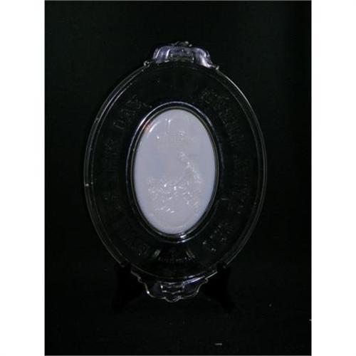 This is a fantastic item for the Early American Pattern Glass collector. The platters or trays with the milk glass insert is very hard to find. This milkglass center bread tray depicts two women clinging or climbing a large rock toward the cross that is embossed "SIMPLY TO THY CROSS I CLING". At the base of the rock is embossed "ROCK OF AGES" in much smaller lettering. On the clear glass surrounding the milkglass center is embossed "Pat. Nov. 23, 1875" and in larger letters "GIVE US THIS DAY - OUR DAILY BREAD". The platter measures 12 3/4" long from handle to handle by 9" wide and 1-1/4" deep. It is in beautiful condition with no chips, flakes or cracks but there are some bubbles and straw marks. All edges remain as sharp as it came from the mold. The Tray is pictured in "American Historical Glass" by Bessie M. Lindsey at page 248, plate 236.