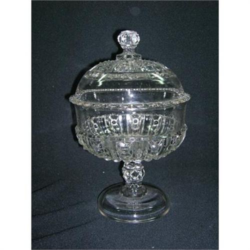 This is a beautiful compote. According to The Collectors Encyclopedia of Pattern Glass by Molly Helen McCain. plate 95, this pattern is called Bowline. She does not identify the maker but it was probably made in the 1880's. This compote has a paneled Bead or Hobnail with a Diamond pattern. It stands 10" tall and is 6" in diameter at the rim. The cupped foot is 4-1/8" in diameter and shows a lot of good honest wear. The patterned standard is attached to the bowl with a wafer. The lid has a scalloped rim and the finial matches the pattern of the standard. There may be some bubbles and straw marks but there are no chips, flakes or cracks.
