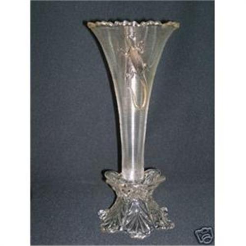 manufacturer is unknown at this time and I could only find one reference in all of my books on Early American Pattern Glass. There is some thought that these vases may be French or English in origin as well. This vase is 12-1/4" tall and the beaded and scalloped rim is 5" in diameter. The lily or trumpet is completely threaded and on two sides has a salamander or lizard climbing up. The threading and the lizard were made in the mold and not applied separately. The Salamanders are stippled. Below the trumpet is a ring of flora or leaves (acanthus style) that form the base. This base is 5" in diameter on the bottom and 3-7/8" at the top with the six leaves. In the Standard Encyclopedia of Pressed Glass by Bill Edwards and Mike Carwile, the only reference I could find, they seem to think it was made as one piece. To me it looks like the trumpet or lily is attached to the base with a thick wafer of glass. There are remnants of gold decoration on the rim and the Salamanders. I'll bet that was a sight when new! There may be some bubbles and straw marks, but there are no chips, flakes or cracks.