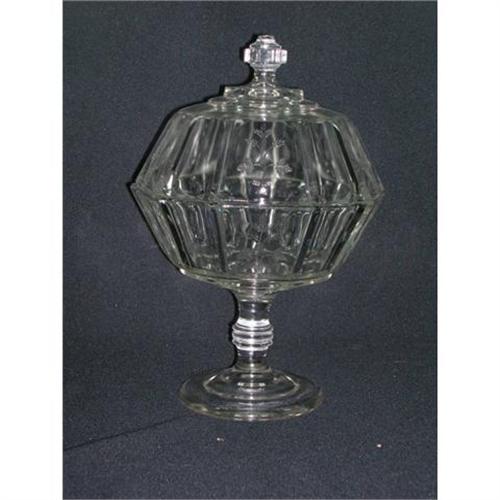 This beautiful Sprig pattern covered compote was made by Bryce, Higbee & Company of Pittsburgh, PA. circa 1885. The original name was Bryce's Royal. The pattern is also known as Indian Tree and as Paneled Sprig. This compote is 12-1/2" tall to the top of the finial (7" without the lid) and the bowl is 8" in diameter. The large foot is 4-3/4" in diameter. The glass is absolutely crystal clear with some minor scratches on the inside of the bowl. There may also be some bubbles and straw marks, but there are no chips, flakes or cracks.