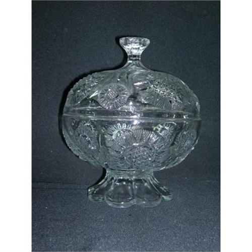 The Solar pattern was made by The U.S. Glass Company of Pittsburgh, PA Circa 1908. The company was in business from 1891 - 1963. They were a consolidation of many factories which produced a vast array of glass during it's years of production. This compote was originally called US Glass No. 15116 or 15150 depending on which book you look at. In The Collectors Encylopedia of Pattern Glass, plate 102 it is noted as 15116. In The Standard Encyclopedia of Pressed Glass it is noted as No. 15150. The pattern is also known as Feather Swirl. This compote is 9" tall to the top of the lid finial, 4-1/2" tall with out the lid and 7-1/2" in diameter. The floral petal foot is 4-3/4" in diameter. The glass is especially clear and while there may be some bubbles and straw marks there are no chips, flakes or cracks.