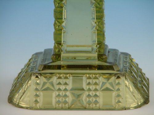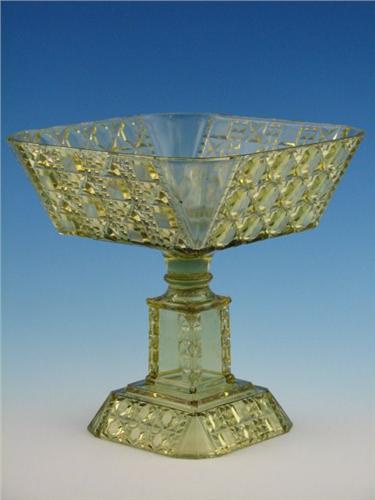 EAPG Valencia Waffle, Square Compote, high standard, Apple Green. Produced by Adams& Company, Pittsburgh, PA, ca. 1885. Condition: minor flakes around base. Dimensions: 8.25"H x 8"D.