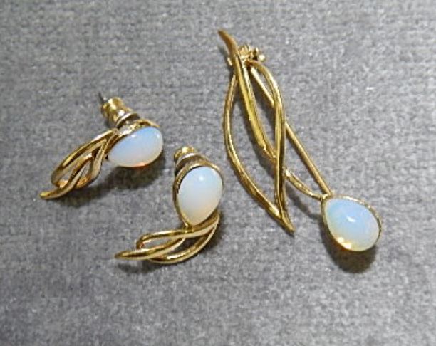 EARINGS & BROTCH SET - PIERCED - GOLD TONE - OPAL ACCENTS