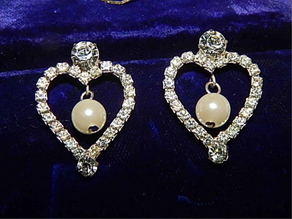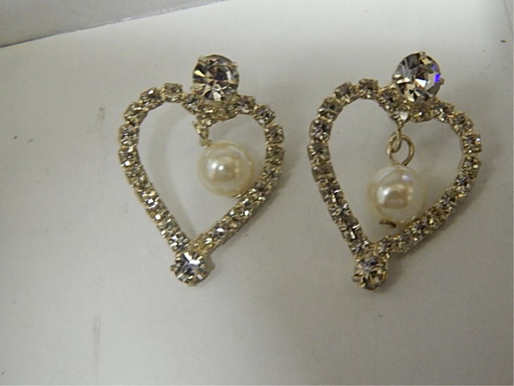 EARINGS - PIERCED - SILVER TONE - CLEAR RHINESTONES AND PEARL STYLE BEAD - HEARTS