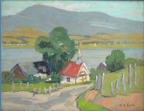 EARLE, Paul Bernard, A.R.C.A., 1872-1955. "View of the Church by the Lake". Huile sur panneau, signée. Datée "June 36" verso. Oil on board, signed. Dated "June 36" verso. 10 1/2" x 13 1/2" - 26.6cm x 34.2cm.