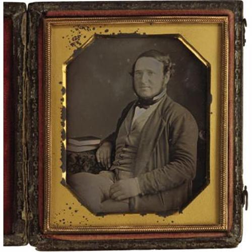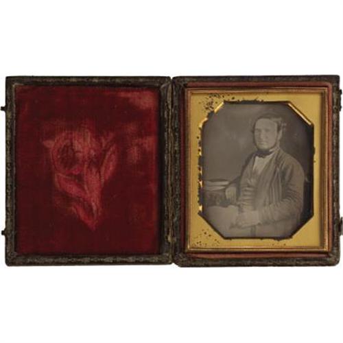 <B>EARLIEST KNOWN PHOTOGRAPH AND ONLY KNOWN DAGUERREOTYPE OF CONFEDERATE STATESMAN JUDAH P. BENJAMIN.</B></I> Cased sixth plate daguerreotype,<B> </B></I>ca. late 1840s, artist and location unknown, likely Louisiana, on plate with early Scovills hallmark made in Waterbury, Connecticut, its leatherette case embellished with tooled gold foliate designs on the lid. The portly Benjamin, a prosperous attorney and sugar planter at the time of this sitting, comfortably wears the genial expression typifying his extant portraits. Grant Romer of the George Eastman House International Museum of Photography and Film has examined this daguerreotype and feels that it was made in 1846. As such, it was probably taken in either New Orleans or Baton Rouge, well before the young Benjamin entered the national political arena. Prior to the discovery of this image, the earliest known photograph of Benjamin was an ambrotype. The spectacular unpublished portrait offered here is unique by virtue of the daguerrean process and is highly relevant to the historical record of Louisiana, the United States, the Confederacy and, especially, to the Jewish experience in 19th century America. It is in exceptionally fine condition with only trivial marks and the merest hint of marginal haloing.<BR><BR>Judah Philip Benjamin (1811-1884) is arguably history’s greatest Jewish-American after Albert Einstein. A child immigrant from the Virgin Islands, Benjamin was raised in Charleston’s dynamic mercantile culture by a father who founded the nation’s first Jewish Reform congregation. Opportunity lured the young Carolinian westward and the talented Benjamin was admitted to the Louisiana bar within a year of his 1832 arrival. By 1842 he was sitting in the state legislature. The turbulent 1850s found Benjamin serving in the U.S. Senate as an advocate of Southern interests. There he befriended the likes of Jefferson Davis, who no doubt was impressed by the Louisiana senator’s intelligence, eloquence and energy.<BR><BR>In February 1861, Benjamin followed his state into the Confederacy and was immediately given a cabinet post, becoming the new nation’s first Attorney General. In September 1861, however, he was named Secretary of War and took personal responsibility for several military setbacks that happened during his watch. In March of 1862, President Davis wisely chose Benjamin to head up the increasingly active Confederate State Department. He remained the Secretary of State until the final dissolution of the Confederate Government in May 1865. Benjamin proved himself a political visionary with a knack for diplomacy. He blossomed. Although failing to secure foreign recognition of the Confederacy, Benjamin’s efforts were largely responsible for orchestrating critical material aid from sympathizers abroad. War’s end found a wanted Benjamin fleeing the United States for refuge in England. Ever resourceful, he launched a third legal career and was a very successful London barrister for the rest of his life. <BR><BR><B>Please note:</B></I> The third image has been "flipped" to show Benjamin as he appeared in life. Original daguerreotypes are actually mirror images of the actual subject.<BR><BR><b>Shipping:</b> Framed - with Glass, Small (<a target="_blank" href="http://www.heritageauctions.com/common/shipping.php">view shipping information</a>)