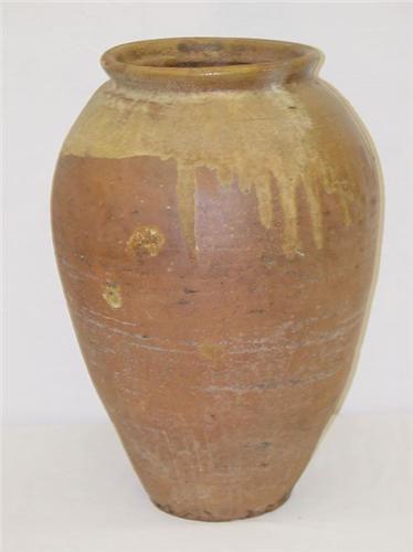 EARLY 17" REDWARE STORAGE JAR OR VASE-GLAZED TOP QUARTER ON SHOULDER & RIM (POSSIBLY OF SOUTHERN ORIGIN) - MINOR GLAZE LOSS TO TOP RIM & IMPERFECTIONS