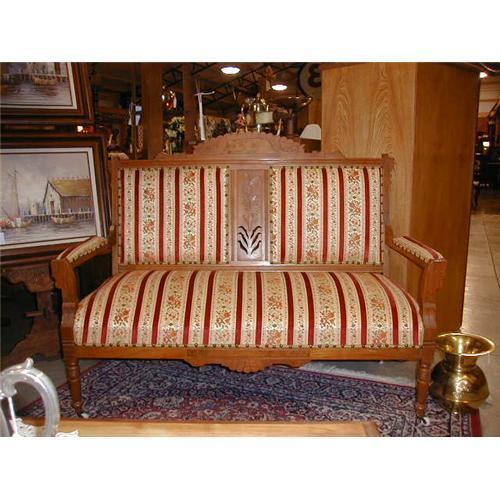 This exceptional piece is a early 1800's parlor settee. The back features a beautifully carved top and a wonderful veneer inlay. The center has a very nice applied carving detail and an open fret leaf design. There is more carving on the front of the arms and legs. The front legs are turned and all of the legs are on what appears to be the original rollers. The settee is upholstered in a striped fabric with a cream background and details in burgundy, green, coral and pink. The edges are finished with a nailhead trim. The top of the arms are also upholstered. The fabric is a bit faded but overall the settee is in very good condition with just slight wear from normal use and age.<p>We do have more photographs that we can email if you are interested. Please contact us with