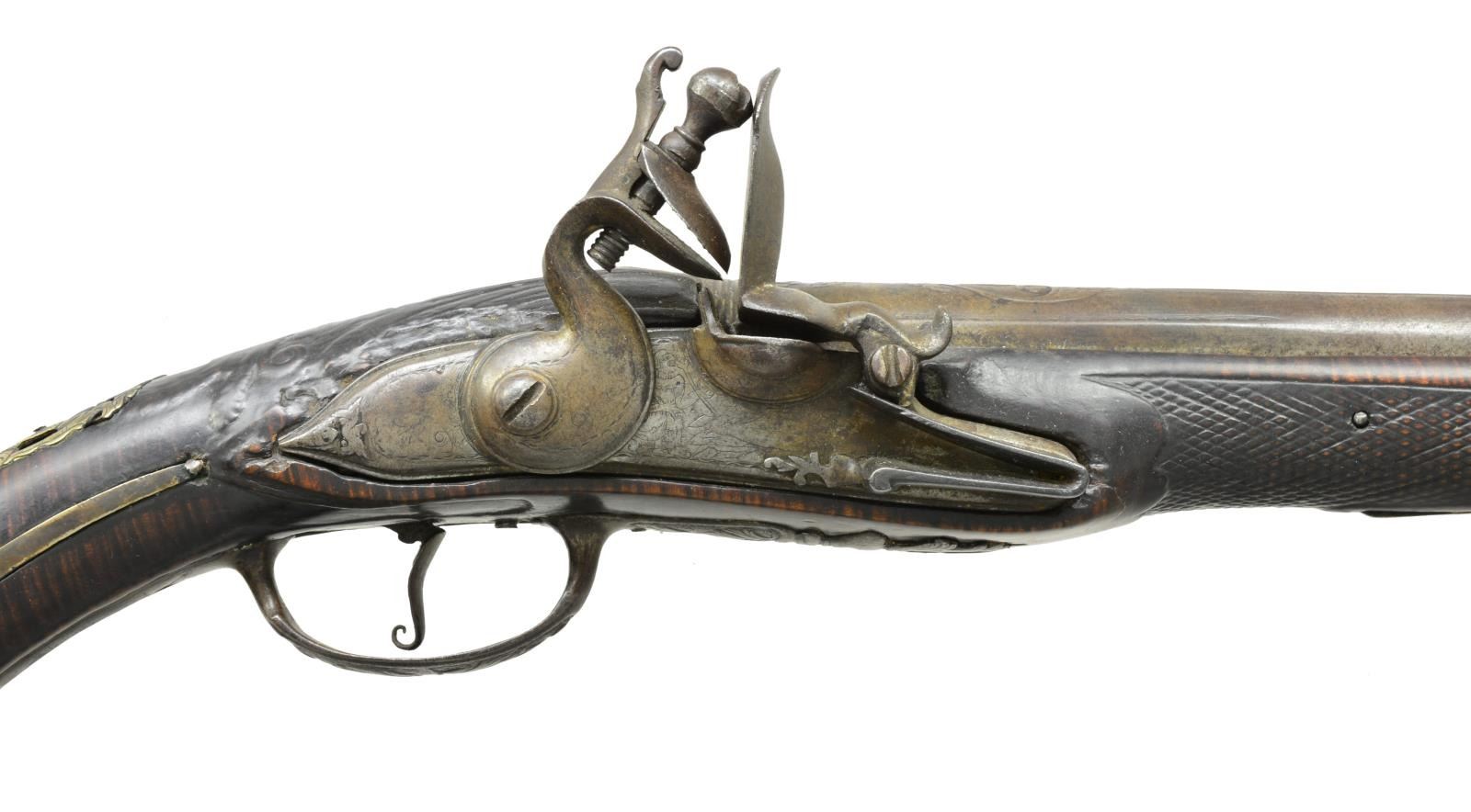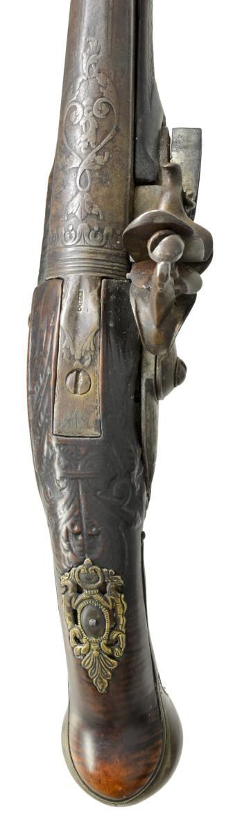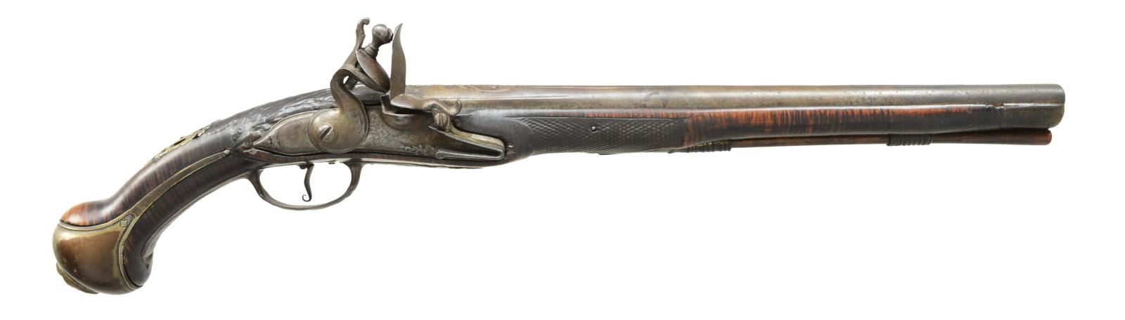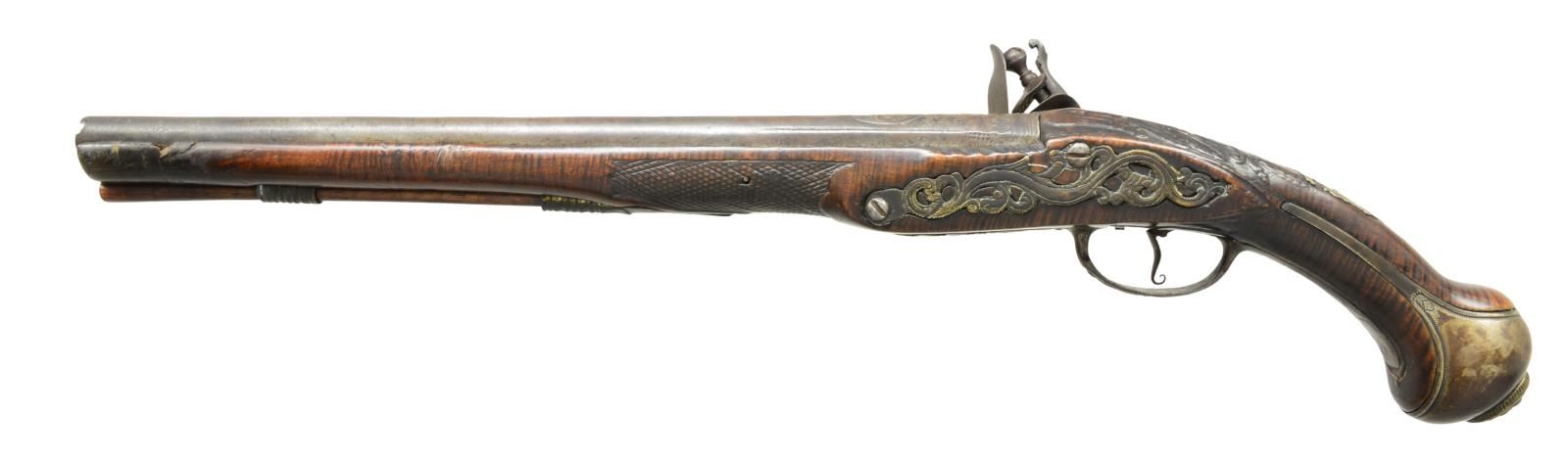 Cal. 60. NSN. Bbl. 14 1/2" caliber rnd. flared bbl. w/ raised relief decoration at breech & unknown makers mark on tang. Elegant 21 1/2" Mediterranean flintlock pistol w/ chiseled & engraved mts. & moldings. Chiseled iron trigger guard, cast pierced sideplate & thumbplate, butt has grotesque mask decoration, horn nose cap. Stock has molded design rear of tang, checkered forestock. CONDITION: good to very good overall, well worn, iron mottled gray patina, sideplate poorly fit w/ repair at front screw, buttcap has mixed patina w/ traces of silver plate. Walnut stock has hand worn patina w/ striping. There is a chip on left side of bbl. at muzzle. PROVENANCE: From the Collection of John "Tim" Breth Jr. (01-17772/JS). ANTIQUE. $800-1,200.