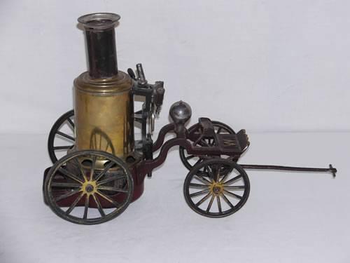 EARLY 18" WEEDENS CAST IRON and BRASS HAND DRAWN WORKING MODEL FIRE STEAMER - STACK PUSHED IN SLIGHTLY AT TOP OF BOILER, MINOR PAINT LOSS, BUT OVERALL VERY GOOD;