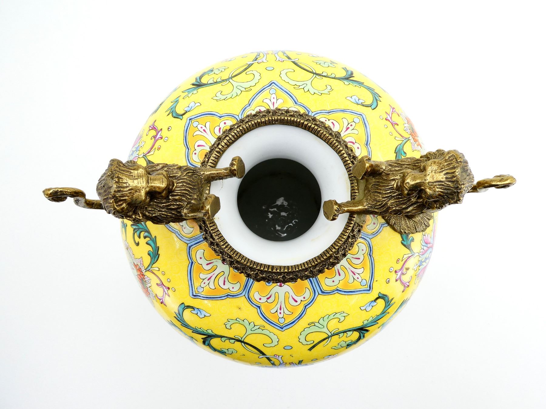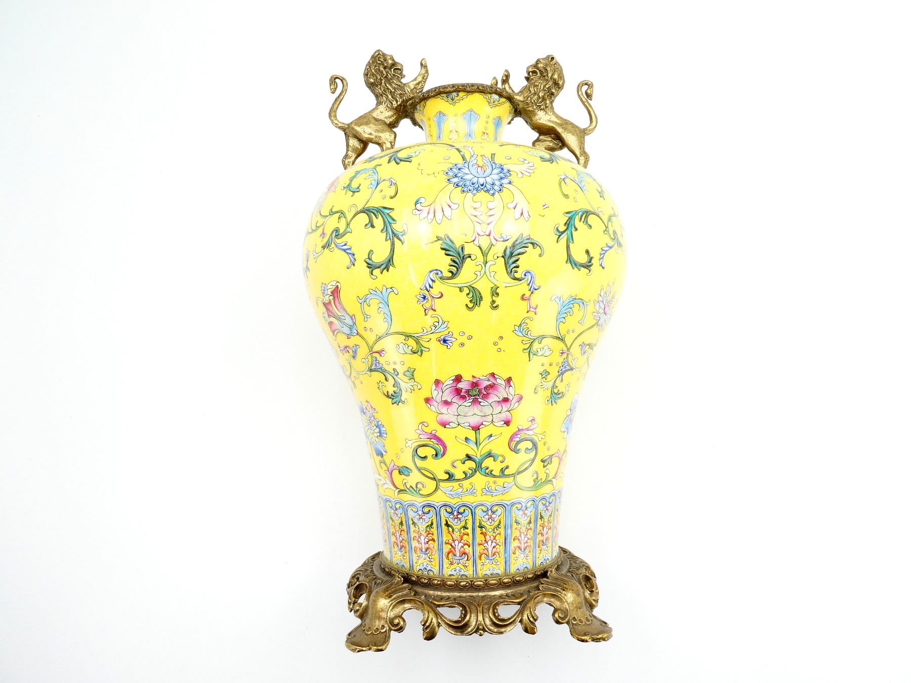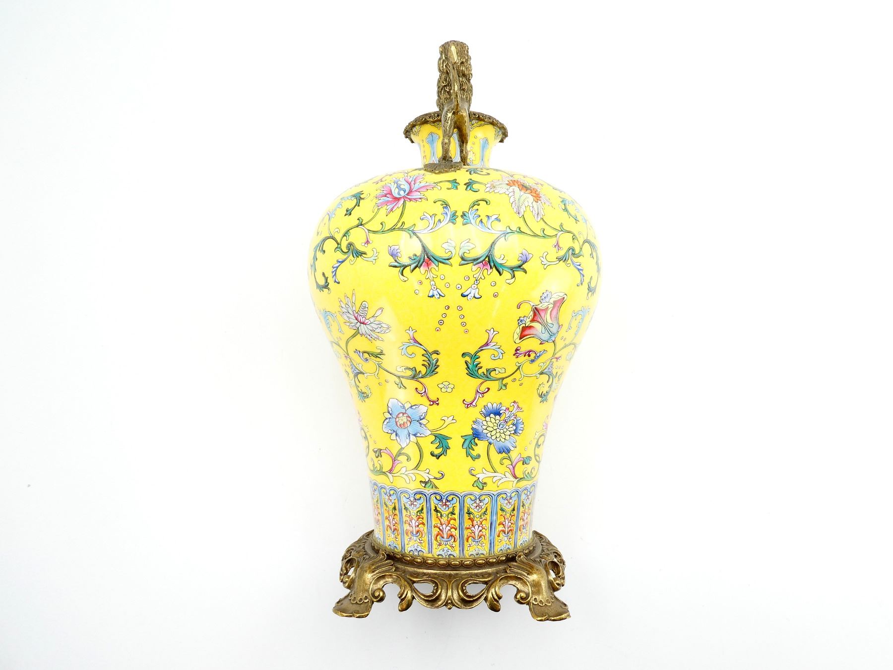 (1) RITUAL VASE, YELLOW PAINTED WITH FLORAL DESIGNS, DECORATIVE BRASS FEET / BOTTOM, DECORATIVE BRASS RIM WITH BRASS LIONS ON TOP, BOTTOM MARKED WITH VARIOUS CHINESE CHARACTERS, CROWN OVER "SPINK & SON LTD., EST. 1772", "COLLECTIE, DREESMANN", "M. ME F. LANGWEIL, OBJECTS, ART ANCIENS, DELA CHINE & DU JAPON, 4, BOUL DES ILALIENS, 4, PARIS" & VARIOUS OTHER MARKINGS, APPROX. 8.25" DIA. & OAL APPROX. 19". SEE PHOTOS.