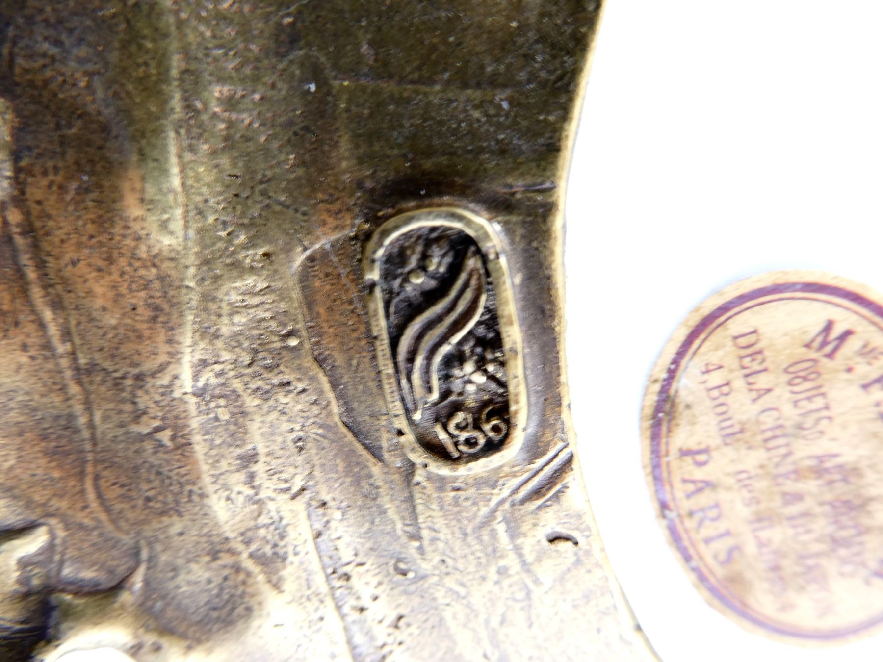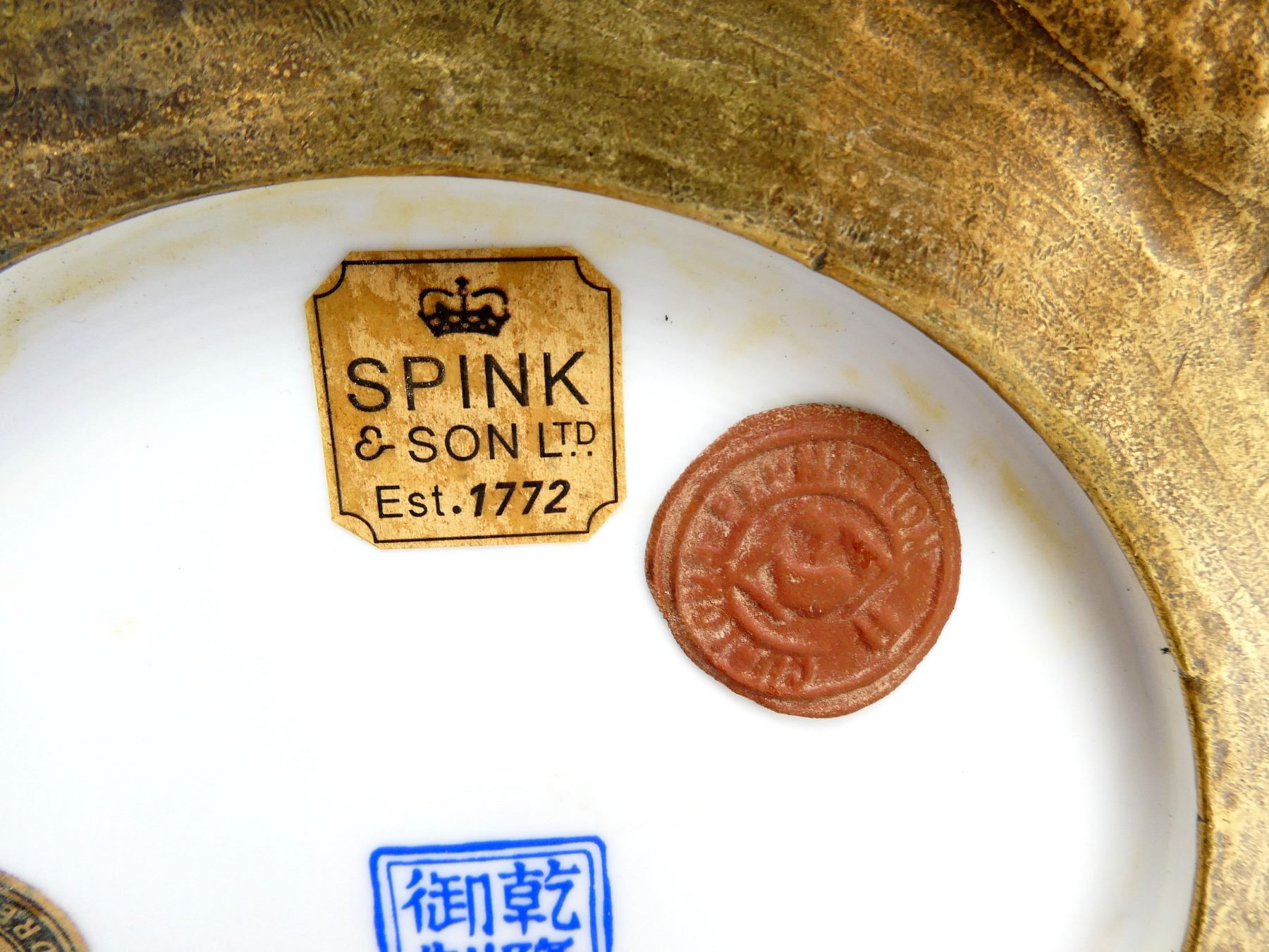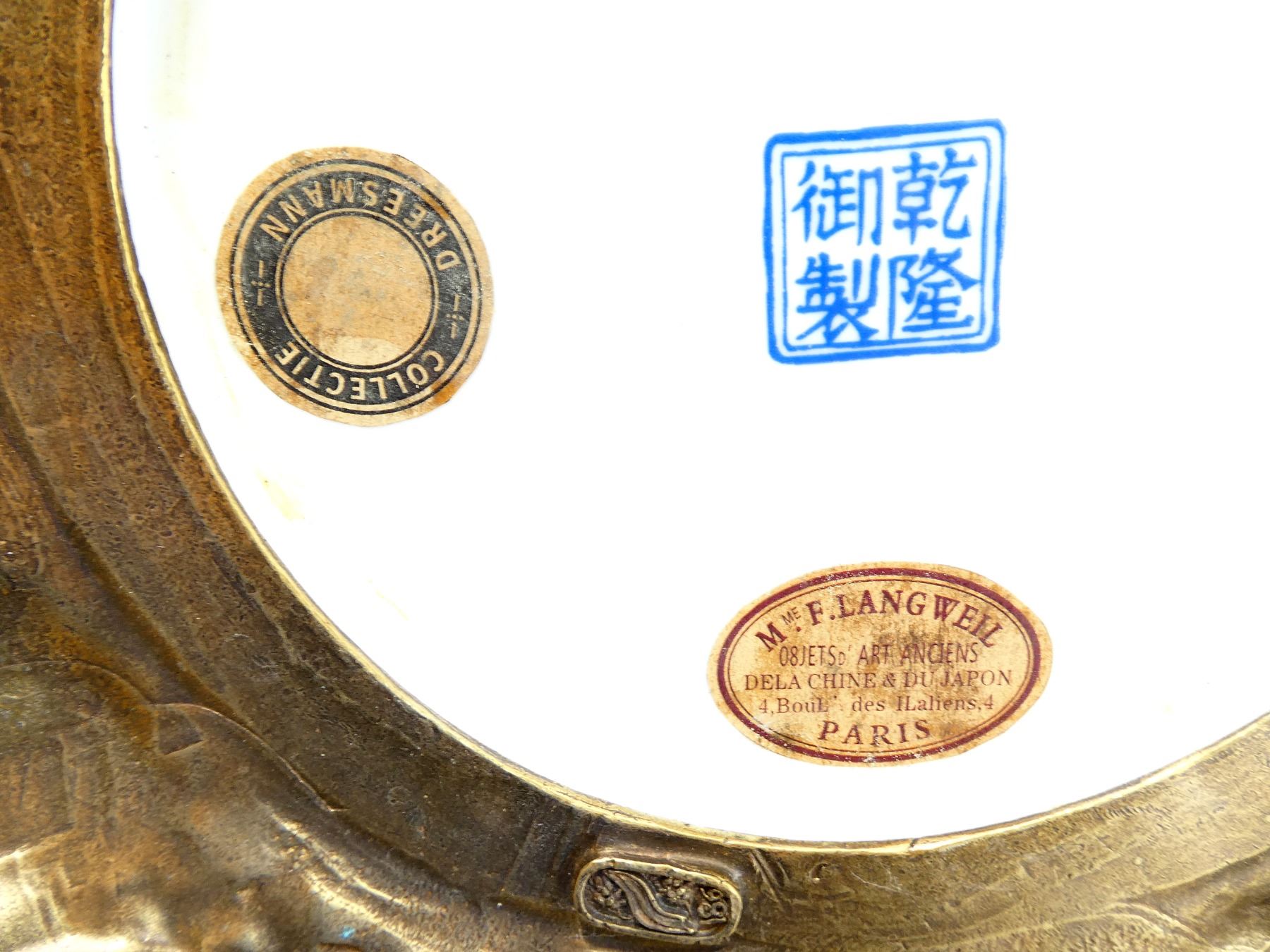 (1) RITUAL VASE, YELLOW PAINTED WITH FLORAL DESIGNS, DECORATIVE BRASS FEET / BOTTOM, DECORATIVE BRASS RIM WITH BRASS LIONS ON TOP, BOTTOM MARKED WITH VARIOUS CHINESE CHARACTERS, CROWN OVER "SPINK & SON LTD., EST. 1772", "COLLECTIE, DREESMANN", "M. ME F. LANGWEIL, OBJECTS, ART ANCIENS, DELA CHINE & DU JAPON, 4, BOUL DES ILALIENS, 4, PARIS" & VARIOUS OTHER MARKINGS, APPROX. 8.25" DIA. & OAL APPROX. 19". SEE PHOTOS.