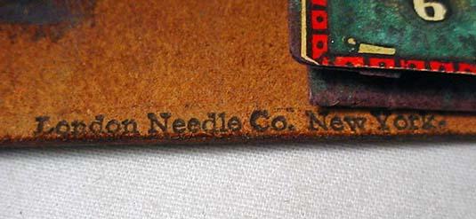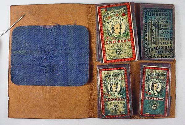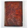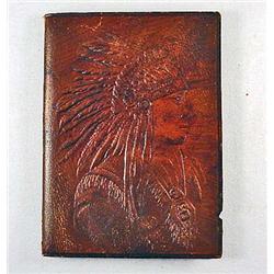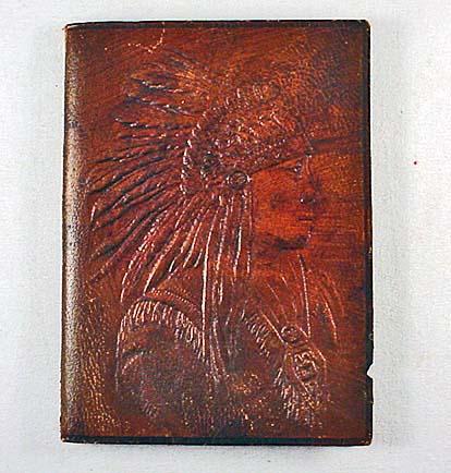 EARLY 1900'S LEATHER INDIAN ADVERTISING NEEDLE CASE - Beautiful image of Native American Indian on front, Western Feul Company, Milwaukie, WI on back. Has needles in cases incl. Martha Washington.