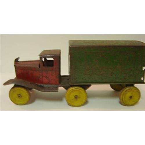 WHAT A GREAT LITTLE TRUCK. YELLOW WHEELS, RED CAB AND GREEN TRAILER, IT IS SO CHARMING. IT IS IN WONDERFUL CONDITION CONSIDERING THE AGE. IT HAS LOST IT'S TAILGATE SOMETIME IN THE PAST BUT THIS IS ONE CUTE TOY. THE WHEELS ARE WOOD, THE REST IS STEEL. WHAT A GREAT PIECE.