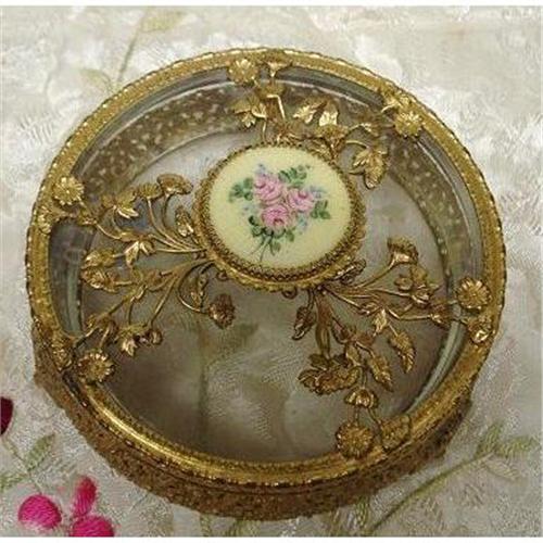 BEAUTIFUL ROUND JEWELRY BOX WITH GLASS LID ADORNED WITH CAST METAL FLOWERS AND LOVELY ENAMEL KNOB DISPLAYING GORGEOUS ROSES, THE BODY OF THE BOX IS MADE IN VERY FINE FILIGREE STYLE AND IT STANDS ON 3 HEART SHAPED FEET,EXCELLENT CONDITION, NO CHIPS OR CRACKS,WONDERFUL ANTIQUE PIECE TO GRACE YOUR DRESSER!MEASURES ABOUT 2 1/2" HIGH X 5" IN DIAM.,US Buyer to pay 8.00 (heavy) for shipping plus insurance.THANKS.