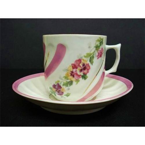 GORGEOUS LATE VICTORIAN/EDWARDIAN HOT CHOCOLATE MUG, MADE IN GERMANY, SHOWING WONDERFUL LUSTER PINK DECORATIONS AND MY FAVORITE FLOWERS, COLORFUL PANSY BLOSSOMS - as per images - Excellent condition, free from chips or cracks,Mug stands about 3 1/4 inch high and saucer measures about 6 inch in diam., THIS IS LOVELY SET, PRETTY AND VERY MUCH UNIQUE, US Buyer to pay 8.00 for shipping plus insurance.THANKS.