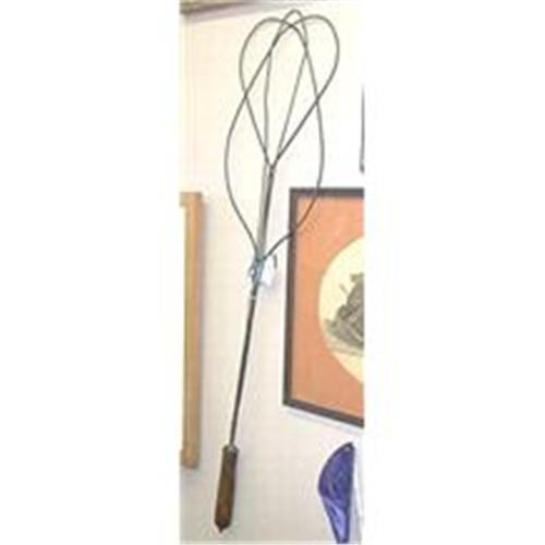 This is a very nice carpet or rug beater. Twisted wire with a wood handle. It is 32 1/2 inches long and 8 1/2 inches at its widest section. It was not originally meant to hang on the wall for a unique decoration so it does have some wear but is in good condition. I think you could still use it if you were a mind to. Personally I think it looks wonderful on the wall.