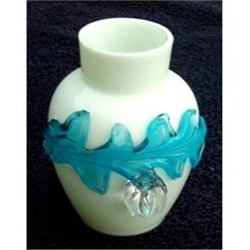 This is a very pretty cased art glass vase with applied glass decoration. It is in excellent condition and is 4" tall and tapers to a 1 1/2" round base, and the top opening is not quite 2".