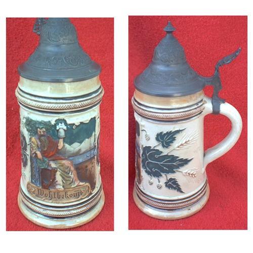 <table width="100%" border="0" cellspacing="0" cellpadding="4"><tr><td><em> </em></td></tr><tr> <td width="100%"> This is a very nice 1/2L German Stein with a highly embossed raised scene and below the man it says "WOHLBEKOM"(I THINK). The sides are embossed with grapes and leaves and a number 407. The lid I suppose is pewter with a fancy design and ornate thumb lift. It is 8 1/2" to the top of the lid and is marked Germany. The handle is hand applied and it is probably early 1900s. It is in excellent condition with only one very small chip on the inside top which is covered by the pewter lid. I bought this from a person I have been buying alot of pieces from in the last few months. All the items have been stored since the 1940s when his grandmother closed her antique shop in NJ and moved to Florida. It had never been unpacked or rewrapped until he brought it in in the original 1940s newspaper. Everything I have bought has been from the mid 1800s to early 1900s. Most of it mid to late 1800s. There is absolutely no doubt about this rare and wonderful piece. </td></tr><tr> <td> </td></tr><tr> <td>Reference #: 44_4_1</td></tr><tr><td>Condition:Excellent No Chips or Cracks</td></tr><tr><td>Year:Early 1900s</td></tr><tr><td>Title:EARLY 1900S HIGHLY EMBOSSED 1/2L GERMAN STEIN </td></tr><tr><td>Location:Titusville, Florida</td></tr></table>