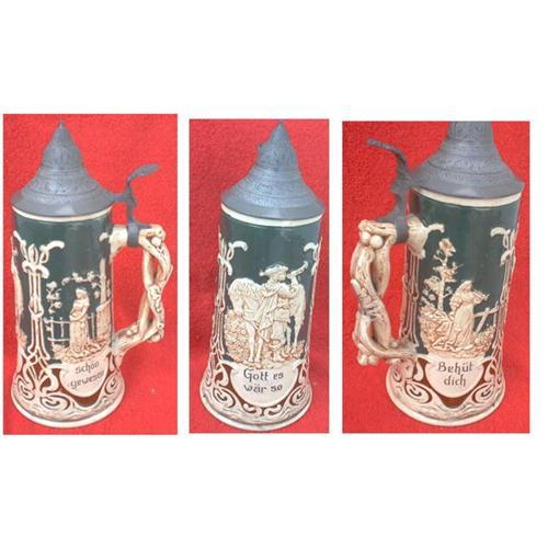 <table width="100%" border="0" cellspacing="0" cellpadding="4"><tr><td><em> </em></td></tr><tr> <td width="100%"> This is a very nice German Stein with three different highly embossed raised scenes all the way around it and inscriptions below each scene. It is not marked with the liter. It larger than 1/2L but not as large lL The lid I suppose is pewter with a fancy design and ornate thumb lift. It is 10" to the top of the lid and is marked Germany. The beautiful handle is hand applied in the shape of branches with leaves and it is probably early 1900s. It is in excellent condition with no chips or cracks. I bought this from a person I have been buying alot of pieces from in the last few months. All the items have been stored since the 1940s when his grandmother closed her antique shop in NJ and moved to Florida. It had never been unpacked or rewrapped until he brought it in in the original 1940s newspaper. Everything I have bought has been from the mid 1800s to early 1900s. Most of it mid to late 1800s. There is absolutely no doubt about this rare and wonderful piece. </td></tr><tr> <td> </td></tr><tr> <td>Reference #: 44_4_2</td></tr><tr><td>Condition:Excellent No Chips or Cracks</td></tr><tr><td>Year:Early 1900s</td></tr><tr><td>Title:EARLY 1900S HIGHLY EMBOSSED 1/2L GERMAN STEIN </td></tr><tr><td>Location:Titusville, Florida</td></tr></table>