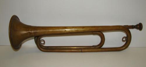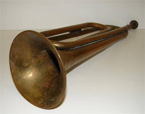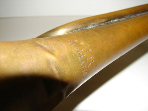 EARLY 1900S U.S. MILITARY BUGLE. Marked "U.S./REGULATION". Shows a small amount of denting and pitting. 16.75" L