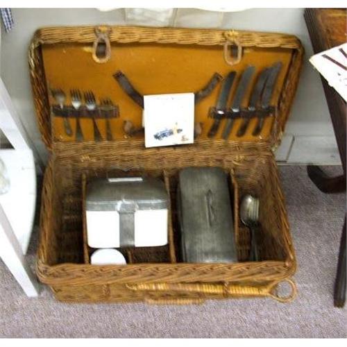 Dine Alfresco with this vintage picnic set. This is a wonderful early 1900s (I believe) picnic set. It was made by Coracle in England, one of the finest known picnic set makers. With any picnic basket you will always find things missing and things added to suit your own needs. So is the case with this one. The three knives are Sheffield so I believe they probably came with the set. The salt and pepper for sure has been added but it is certainly appropriate because the top closure keeps it from spilling. Besides the great basket the rare porcelain and tin food containers are to die for. The square one is 6 1/2" wide by 5" tall and the oblong one is about 10" long by 5" tall and they are in excellent condition. They are original with the Coracle Brand Trademark on the bottom of each one. The basket is about 20 X 11, has all of its original closures and has some minor wear. Leather straps hold the items on the inside of the lid. There is also a round porcelain container with lid that would be from the era but I don't know if it was original to the set. A really great and scarce item.